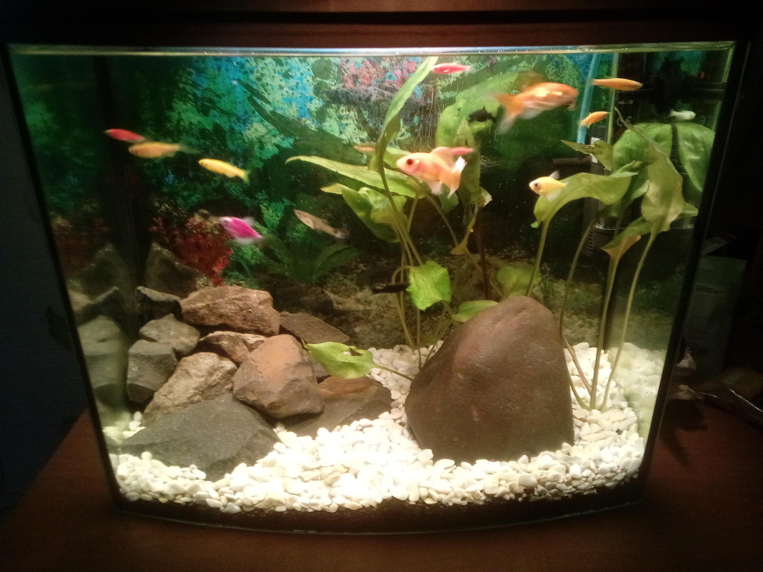 Купил как то двух золотых рыбок,жену порадовать, банку на 10 литров, белые камушки. Спустя несколько дней понял что нужно больше и подвернулся 40 литровый за 100 грн. от коллеги, купил. Докупил ещё мелкий гравий, заказал дешёвый фильтр sun sun за 96 грн. и китайский теплорегулятор. Свет от лампы прищепки 60 ват(8-10 часов в день, лампочка накала обычная). Камни побольше подискал на речке и начал запускать. Отстоял воду, выложил все как надумал, посадил 5 кустиков криптокорины и запустил вуалехвостов и пару гуппи(грунт гравий, а поверх белые камушки) потом докупил 4 тернеции глофиш и вместе с ними принес себе в аквас болезнь манку (зоомагазин не из лучших). Начал лечение: температуру поднял на несколько градусов + кондиционер для воды (малахит). С горем пополам, потеряв двух тернеций, манку побороли. Докупил 8 данио рерио глофиш и две молинезии черные. Вот такой аквас теперь и живёт.