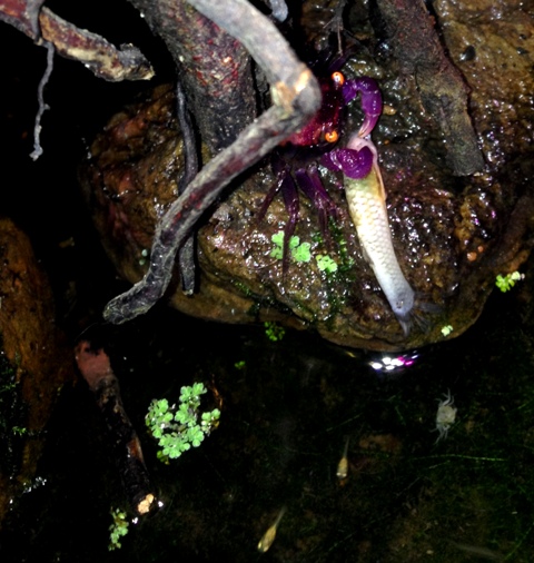 Это опять прыгнул краб ,частичка на которую он прыгнул продолжила плыть ,а мальки разбежались в стороны. Собственно эту картину я и уловил , дорисовав начало по предположению. Мне показалось, насколько боковым зрением я успел отследить , что в этот раз не рыба интересовала краба , а именно объект плывыщий по течению. Можно допустить ,что краб так охотится на упавших в воду насекомых. Краб подросток от первого размножения в этом террариуме , ему около 5 месяцев. Прыгнул с сухого базальта , с 6 см высоты.