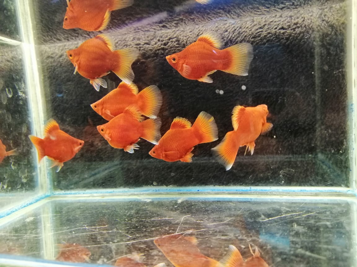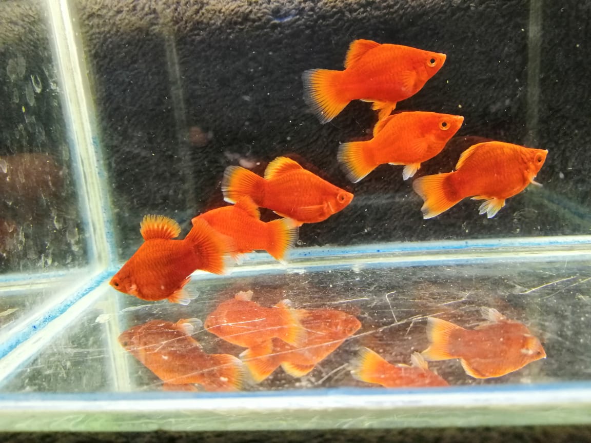 Пецилия макулатус красные, взрослые, около 3,5 см, высокопллавничные, самцы.