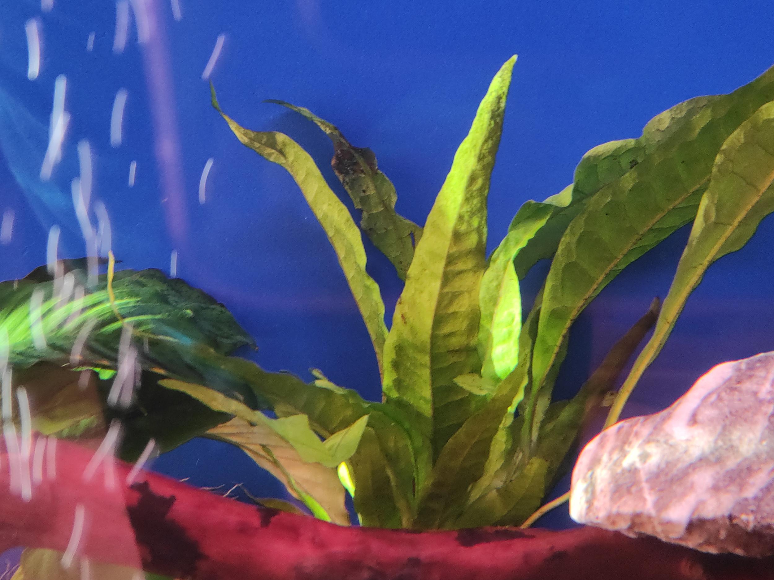 Вот фото этой "каллы". Рыбки радуют, а насчёт растений не знаю как пойдет. Роголистник начал желтеть за неделю. И золотые его обтрепали немного. Тоже самое с элодеей - обгрызают листья и куски откусывают. Остальные растения рыба не трогает, но медленно начинают листья укрываться черными пятнами, особенно видно по ехинодорусу (фото). На некоторых анубиках точно есть борода ещё после покупки. Но тут мой косяк - СО2 нету и с удо я затянула - забываю купить . Баллоны с СО2 мне некуда ставить - тумба специфическая, а другого места нет (не на полу же ставить). Пойду покупать две баночки Tetra CO2 Plus и PlantaMin, а там посмотрим...