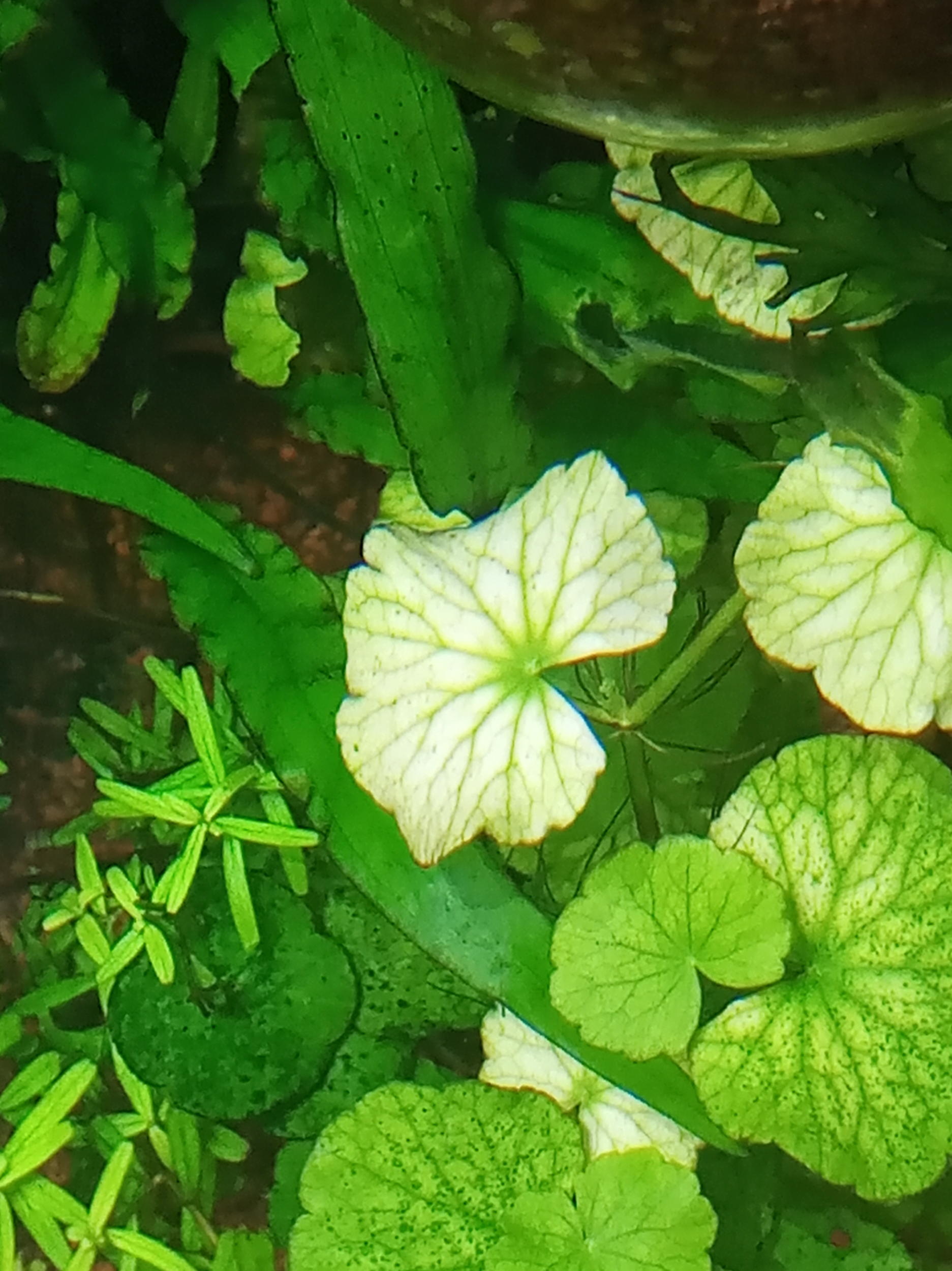 Ещё свежие листья весьма белесые особенно на Гидрокотиле. Уменьшаю свет, перестает все расти.