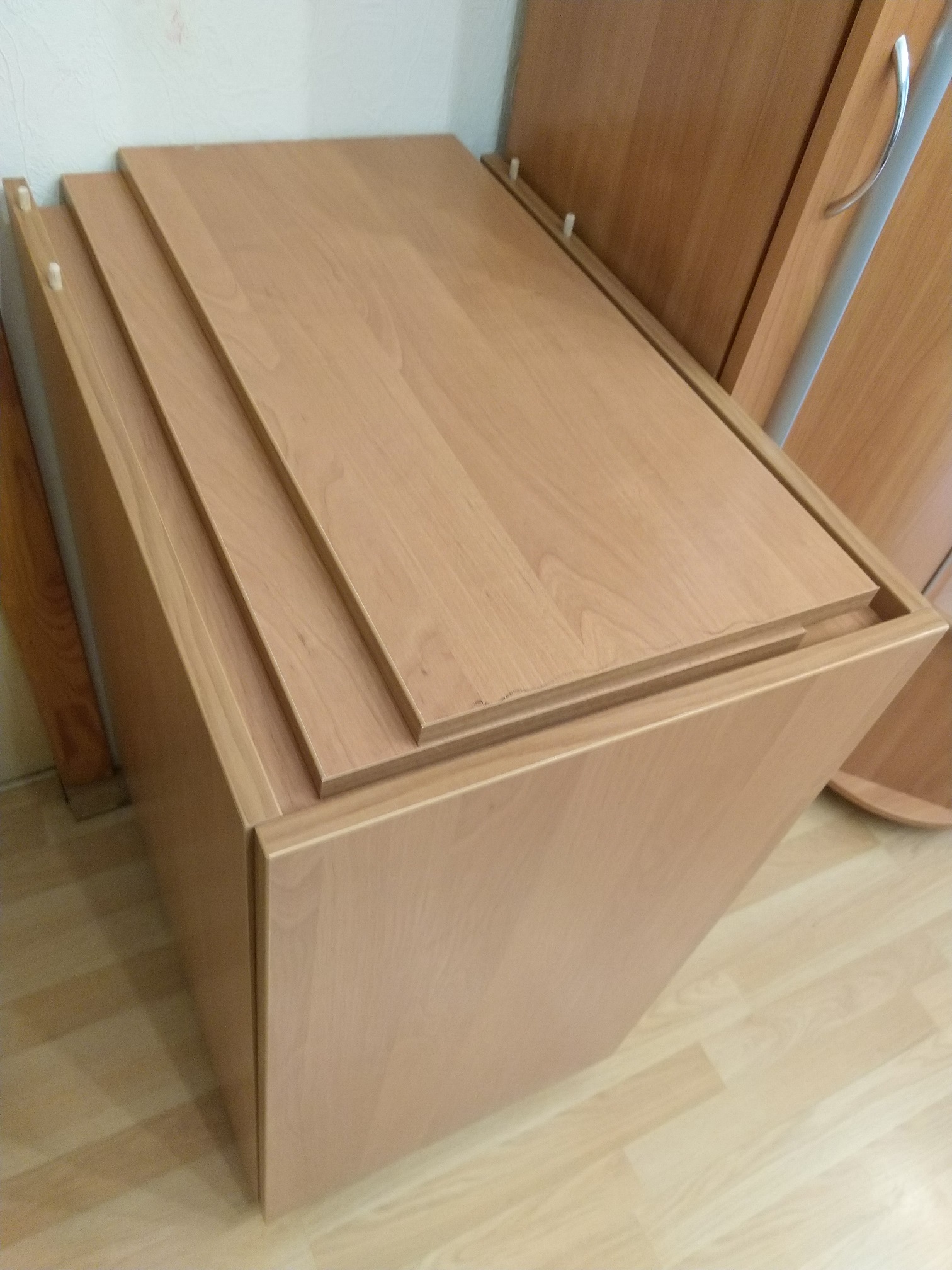 Тумбу решил делать самостоятельно. Из ДСП 18 мм. Цвет - ольха. Кромки ПВХ 0.5 и 2 мм.