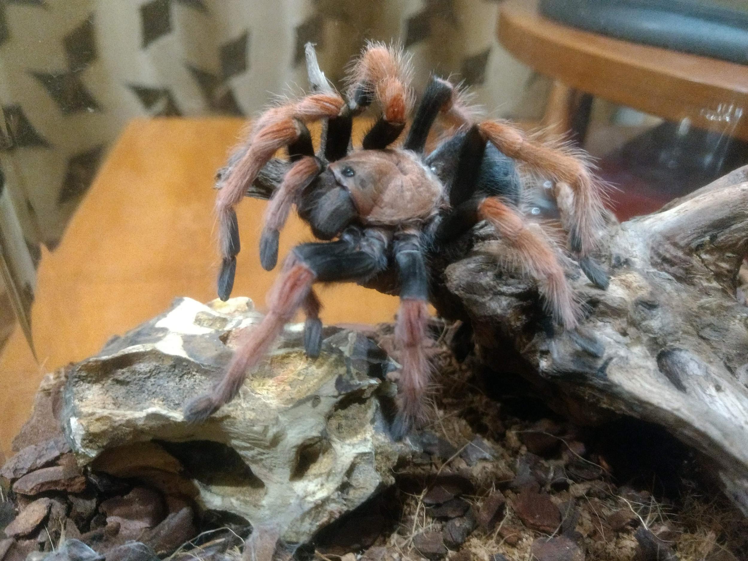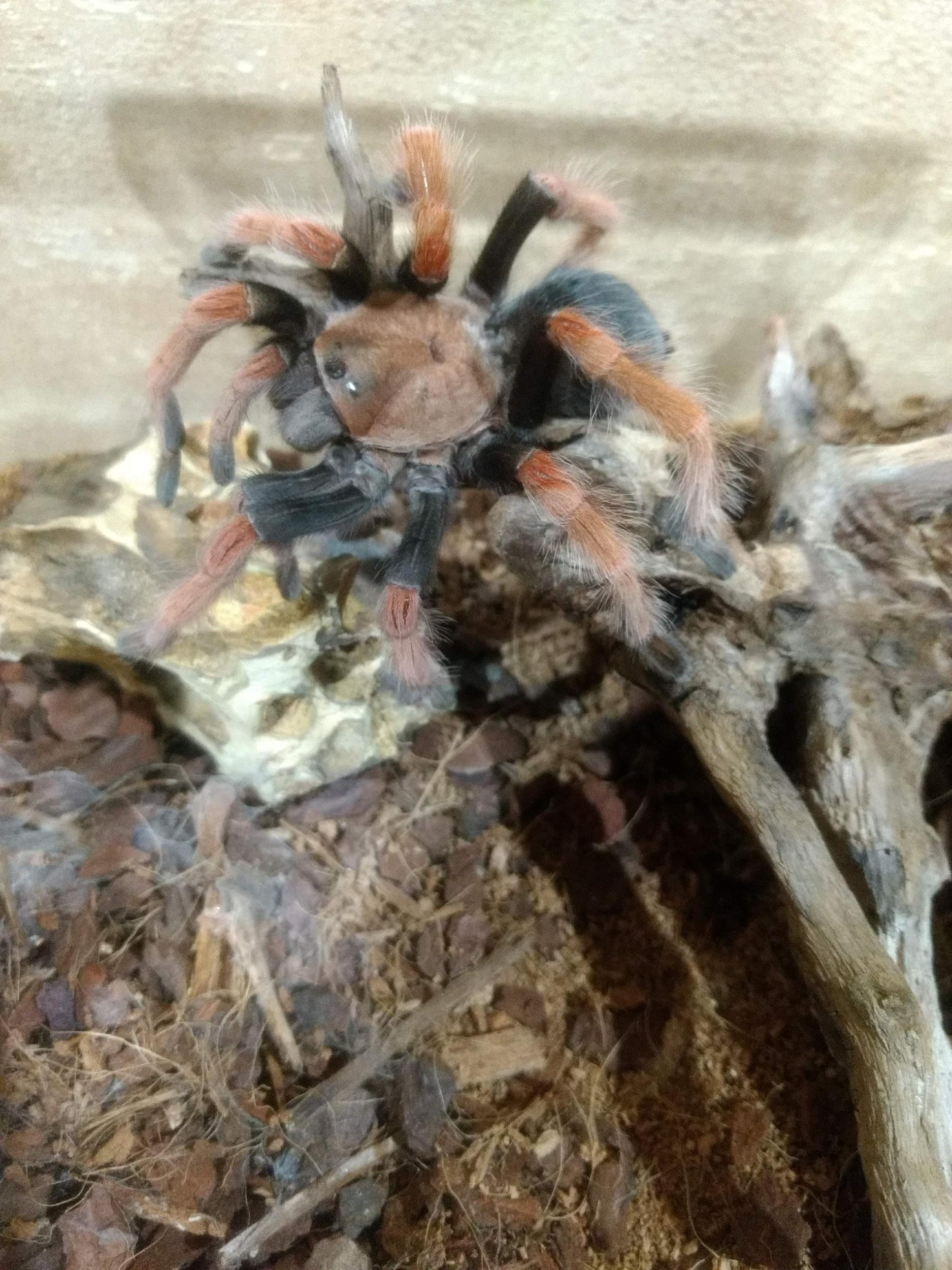 Она изменилась после последней линьки (в декабре). Карапакс стал какой-то более круглый, до этого он был более овальный, как у афонопельм. Абдомен поднятый вверх, как часто, делают афонопельмы, я тоже после линьки у неё не видел. Думаю это из-за возраста. По размеру она до брахипельмы не дотягивает.