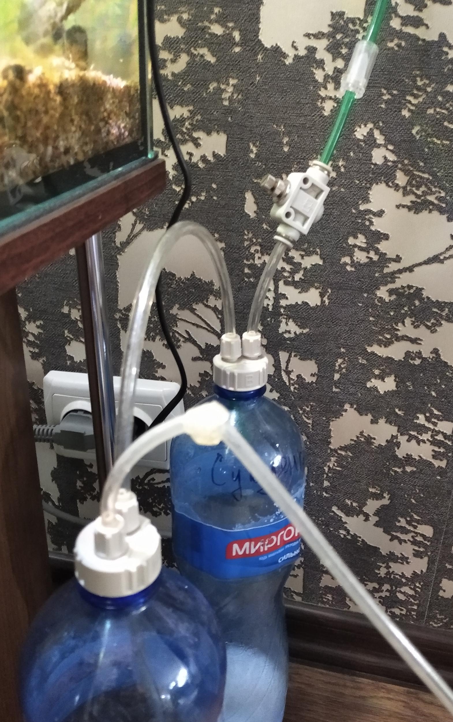 Лучше купить специальные крышечки на бутылку, они стоят в районе 60 гривен. Бутылки без каких либо стаканчиков, обратный клапан, кран тонкой настройки и зажим от капельницы для перекрытия шланга, чтобы создать давление. 200 грамм лимонки на 250 гр воды и пол пачки соды, но я приблизительно насыпаю. Жду пока лимонка растворится, перекрываю шланг, давлю на бутылку с водой - раствор лимонной кислоты попадает на соду. Довожу давление в бутылках до такого состояния, чтобы было тяжело сдавливать их. Потом открываю зажим от капельницы и регулирую краном тонкой настройки подачу со2. Самая положительная работа системы была около двух недель. У меня 2 аквариума с лимонной было. Через год работы этих систем раскошелился на баллон в один аквариум. Жалко, расположение аквариумов не позволяет использовать систему на два аквариума.