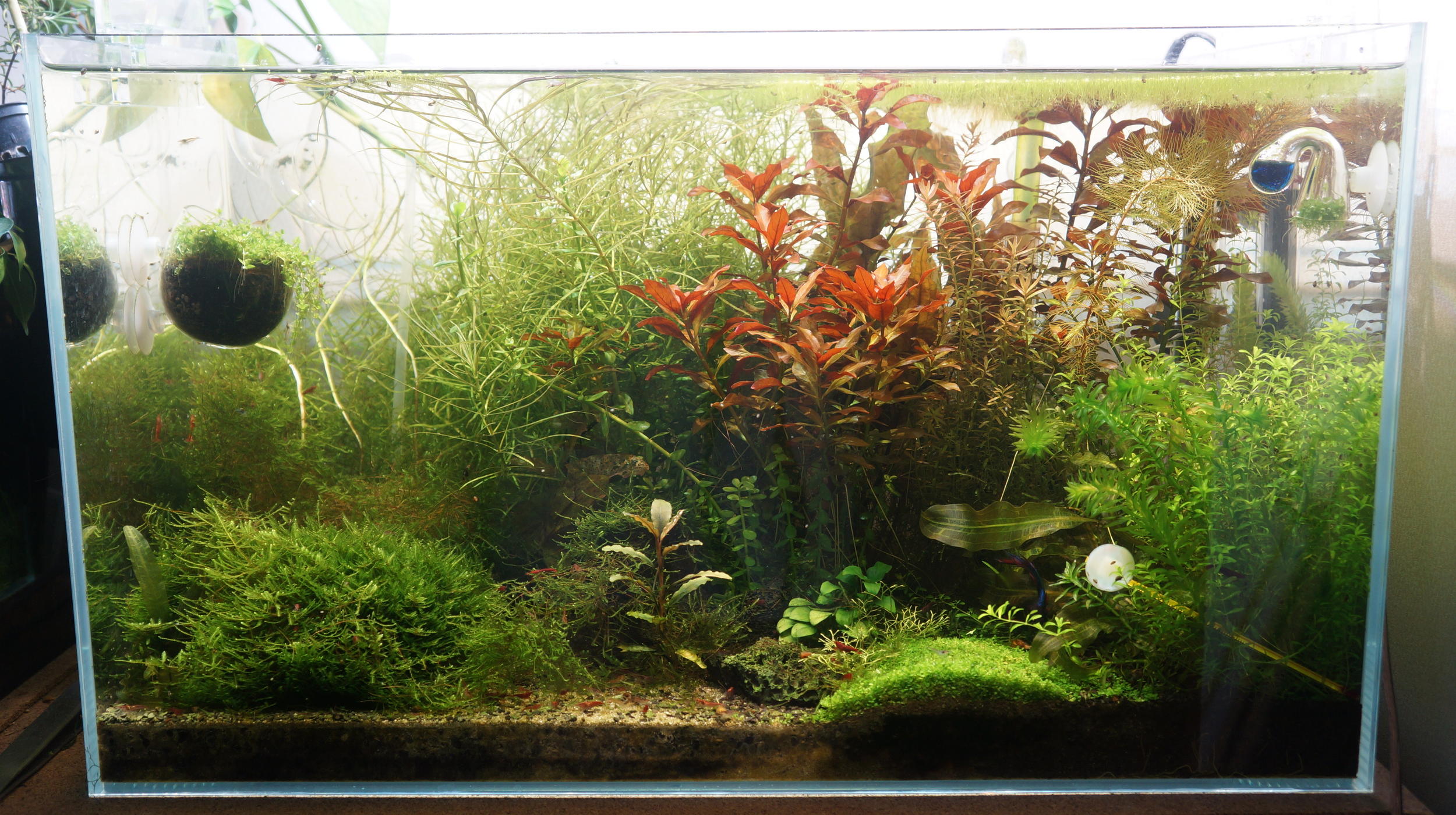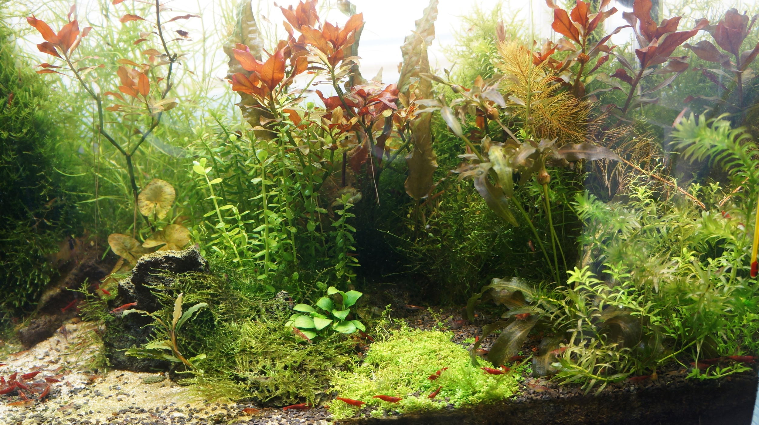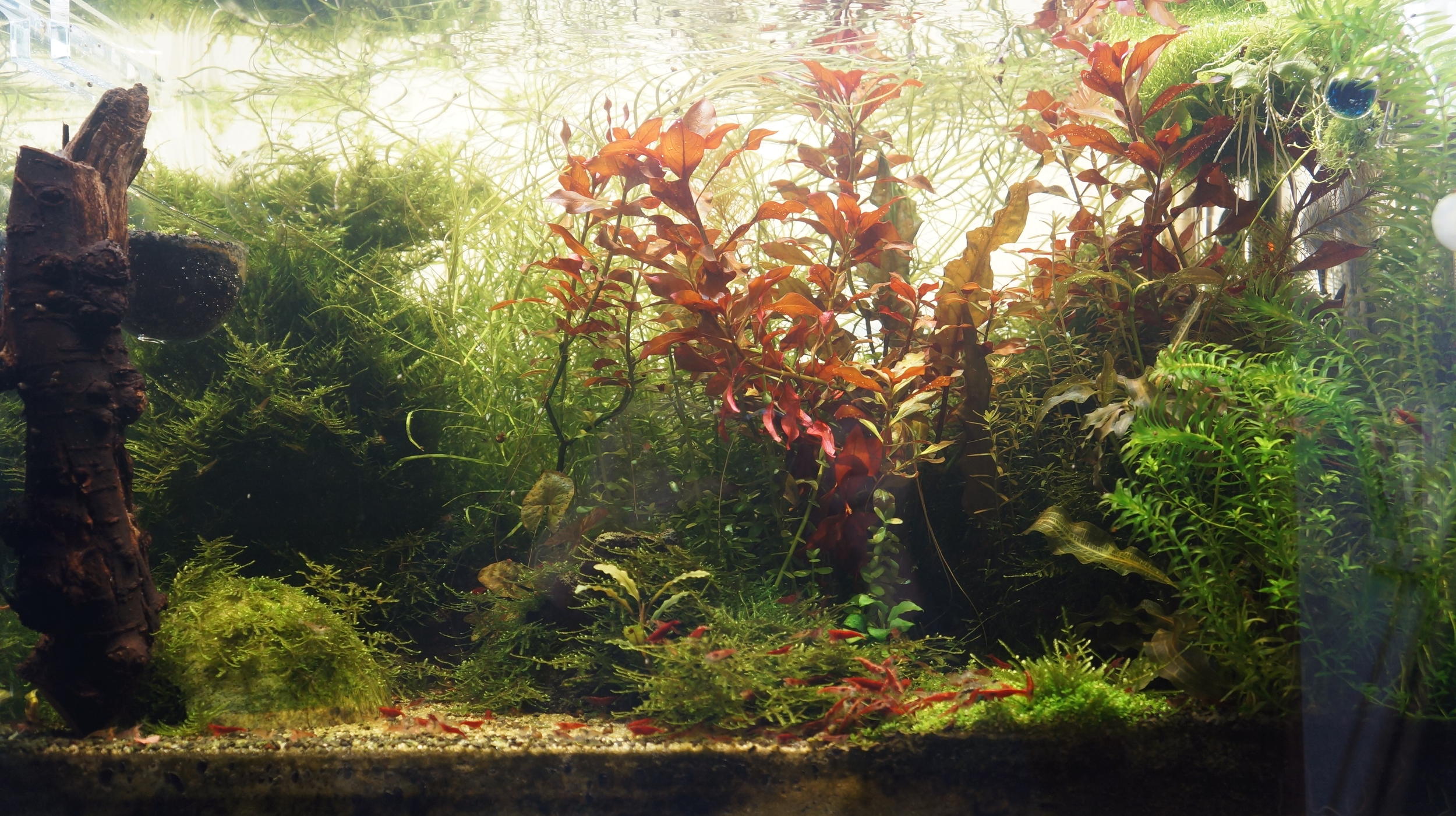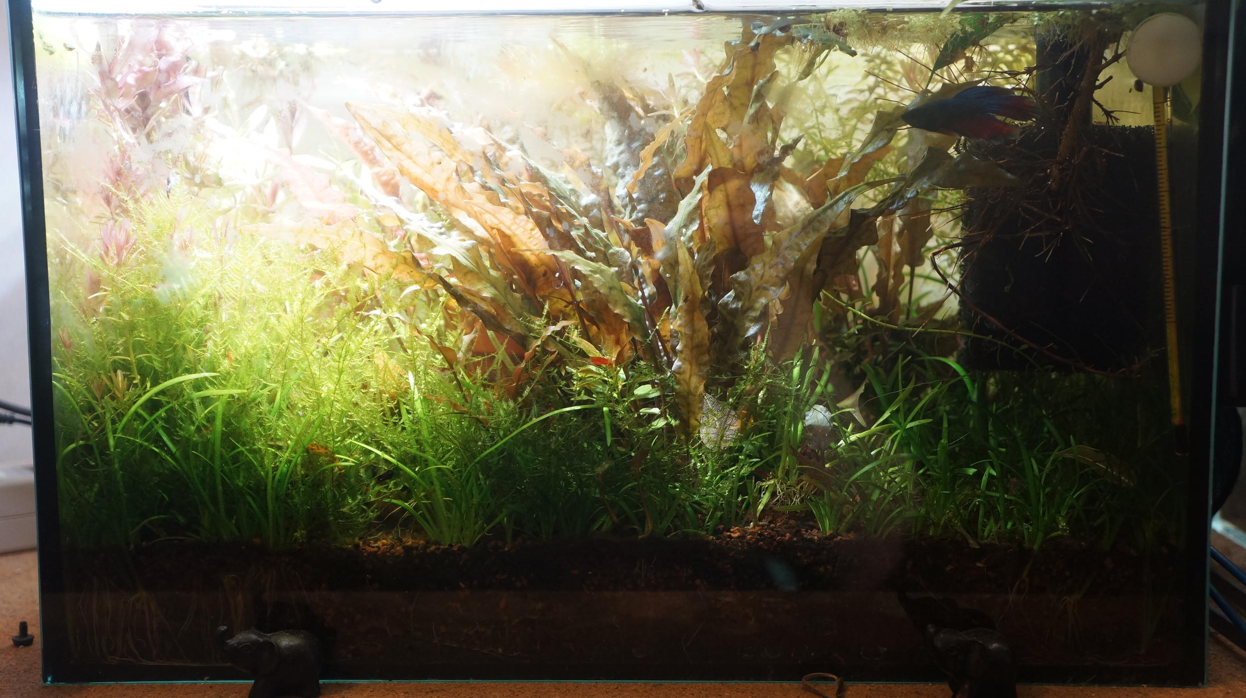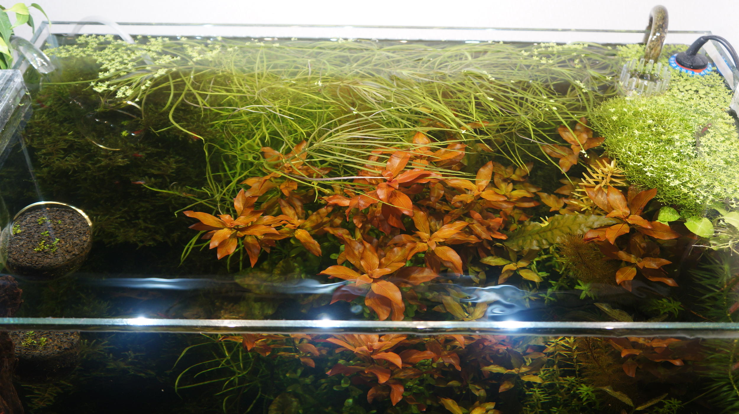 От плавающих по поверхности растений пока избавился, за исключением риччии. Над водой растет людвигия, погостемон как-то не особо хочет вылазить из воды (не уверен, что за сорт, наверное нужно попробовать погостемон эректус).