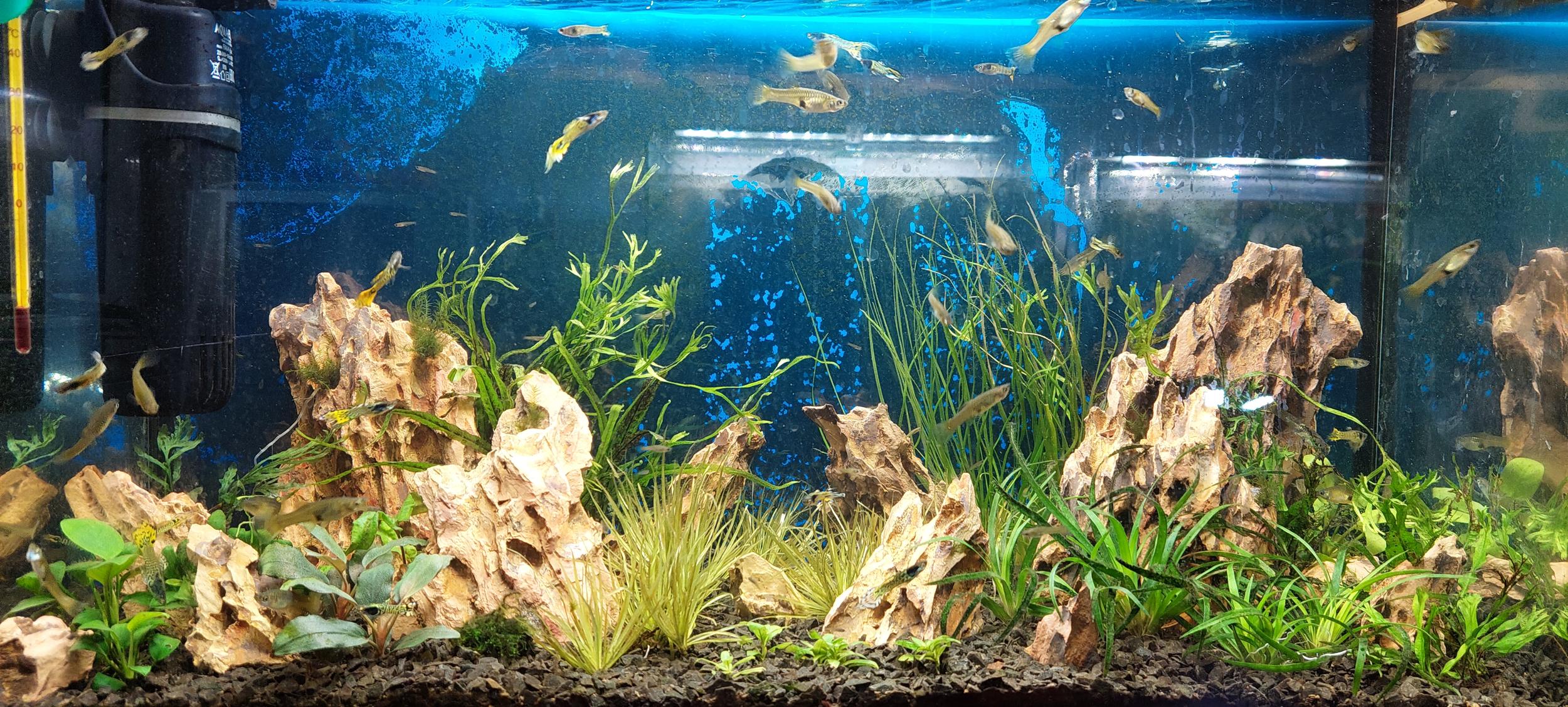 Вирішив опублікувати фото свого акваріума. Завжди відтягував цей момент, то щось не так заросло, то рибки рослину висмикнули, то рослини не такого вигляду як хотілось, але хай це будуть фото в процесі, як виросло так і буду фотографувати. Розмір акваріума 125/45/50, від Акватики. Якість банки хороша, він у мене маленький землетрус витримав). Рескейп був місяць тому, світло саморобне на двох профілях Б52, у кожної балки окремий дімер на білі, основні леди. В результаті балка спереду виставлена на меншу потужність, ніж задня балка. Оскільки спереду у мене ростуть анубіаси, крипти, буцики і щоб вони не заростали ксеном придумав таке рішення. А от на задньому плані росте ротала Hra, інші довгостеблові і їм відповідно потрібно більше світла. Фільтр FХ 4, хороша машинка. Населення акви, як бачите, скалярії, присцили, гупії, родостомуси, є навіть телескоп. І хоча в цих рибок погана репутація в травниках, він тільки один раз висмикнув мені гігрофілу компакт, а так ніякої шкоди при такому підборі рослин не чинить. В акваріумі є подача СО2 по таймеру. Добрива подаю ситуативно і в принципі рідко. Діяльності риб цілком вистарчає. Сам акваріум задумувався як «лінивий травник», тому так і підбирались рослини, обслуговування і заміна води 40% раз на два тижні.