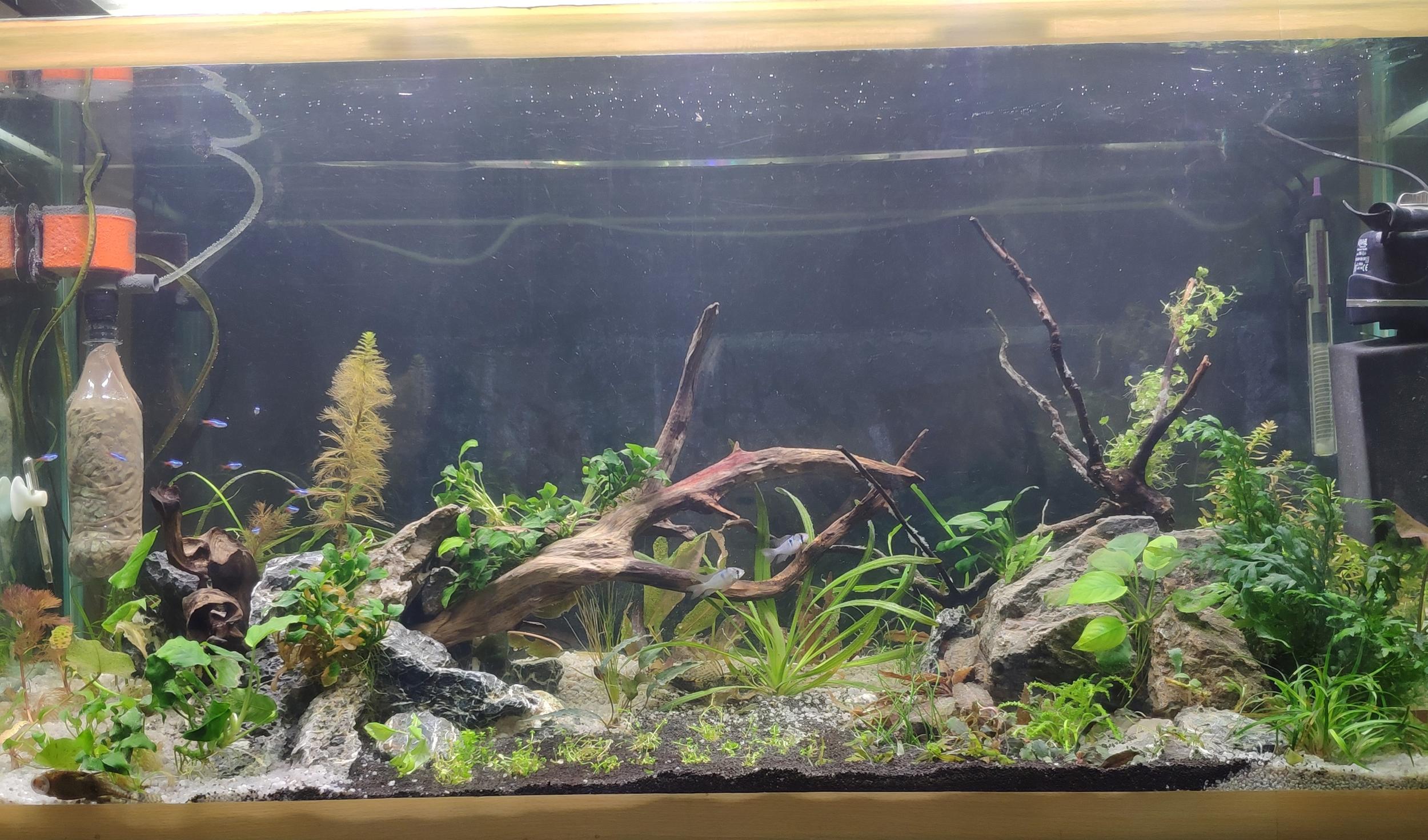 Мне презентовали коряги из аквариума,растений еще :пересажены растения, немного камни маленькие переставлены, подмена части воды, коагулянт что бы быстрее убрать муть и цеолитовая блондинка, на ночь запустила рыб( к воде постепенно приучала)