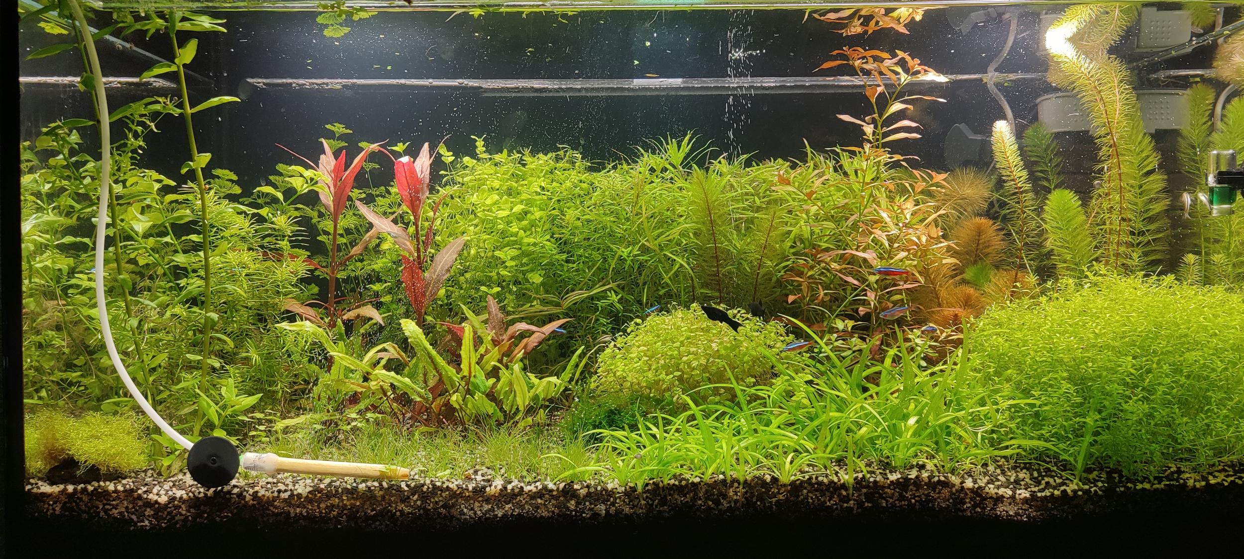 Після того, як припинив лити перекісь на наступний день відразу зявилась, нова для мене водорость, яку я так і не оприділив, врроді оленячий ріг, вроді ні. Від чого зявилась, важко сказати, вроді і нітрати стали на місце (15мг/л.) Фосфати, як обнулялись, так і далі обнуляються, я почав щоденно вносити фосфат, щоб тримати одиничку і мінімальну дозу заліза. Був момент, коли я прогавив подачу со2, закінчилась лимонка і дропчекер посинів, можливо це спровокувало спалах водоростей. Взагальному рослини ростуть, стрижу, викидаю. тільки місцями є дві зарази.