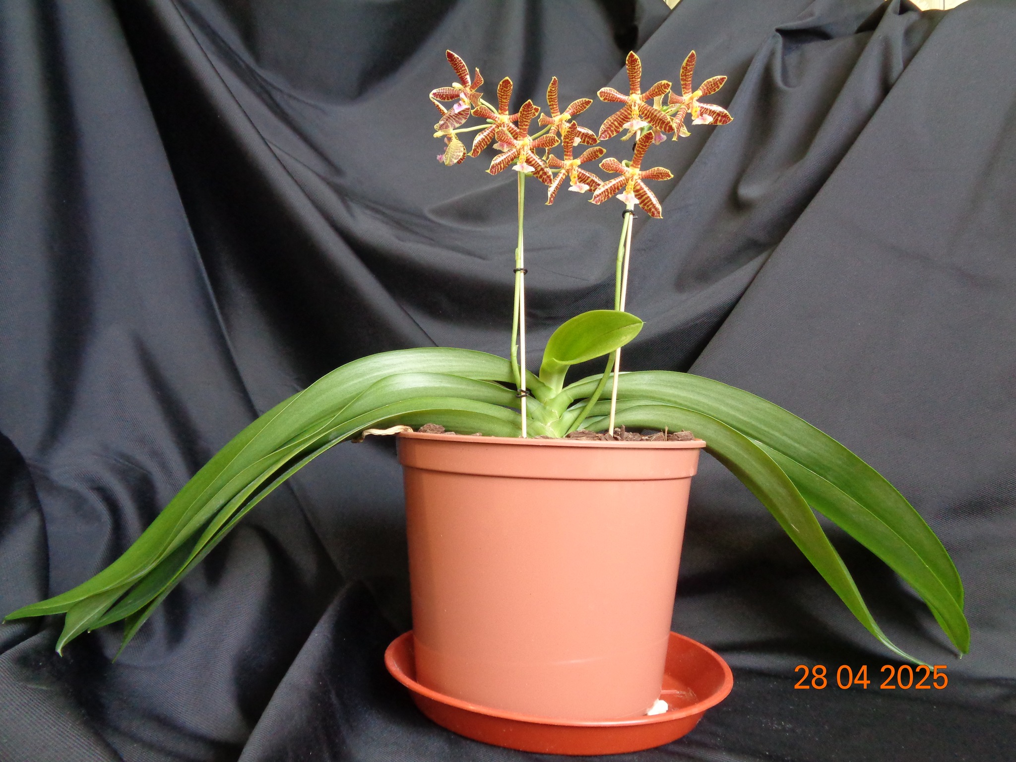 Phalaenopsis Hymen (Phal. mannii ‘dark’ x Phal. lueddemanniana) (первинний гібрид) чергове цвітіння, після пересадки. Пересадка була вже з наполовину вирощеними квітконосами.
