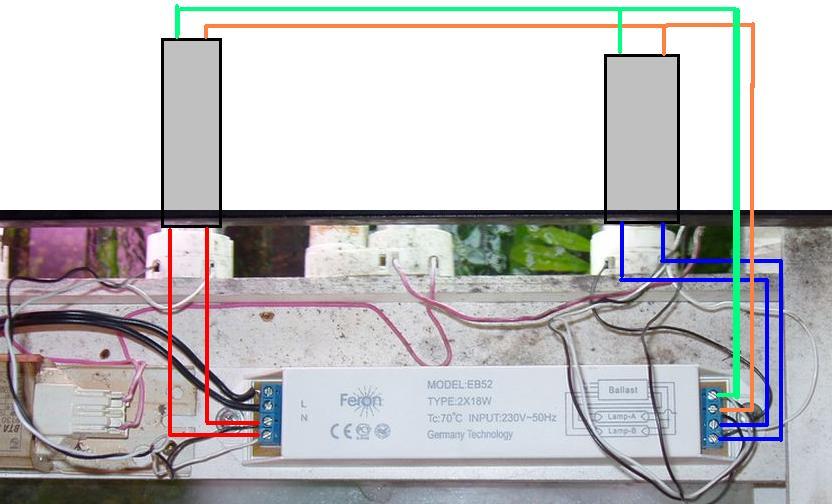 Вобщем так: На рисунке(чтоб не путаться) я раскрасил все провода разными цветами. Вам нужно взять 2 провода(на рис. ЗЕЛЁНЫЕ), которые были в старом балласте, скрупить вместе и засунуть в одну клему в новом балласте(тоже зелёная!)