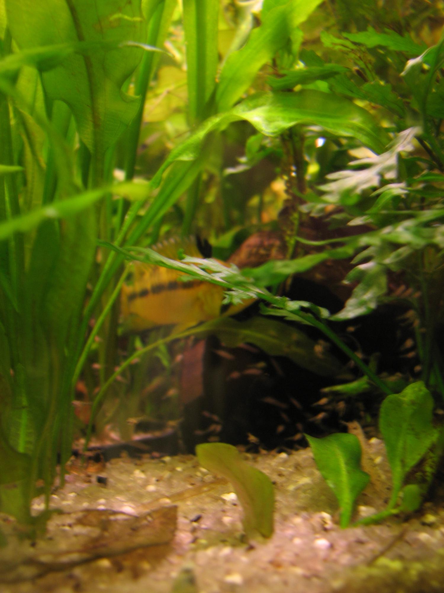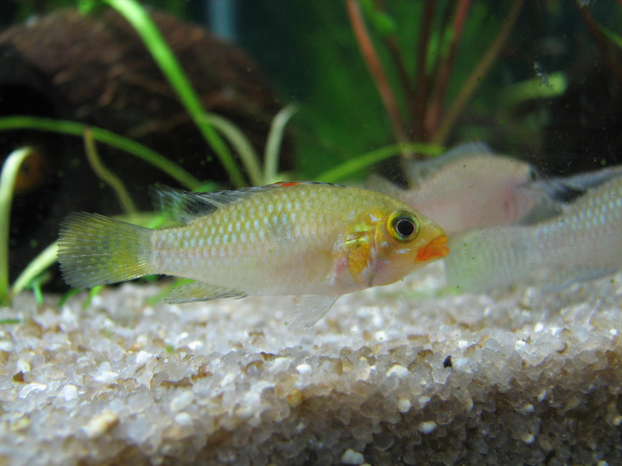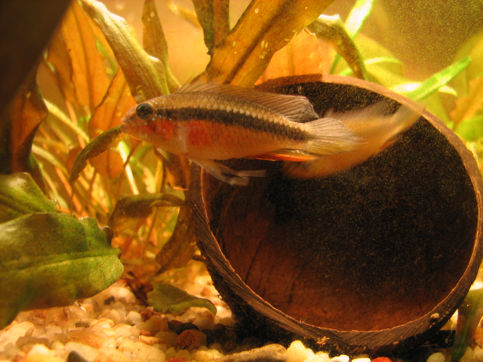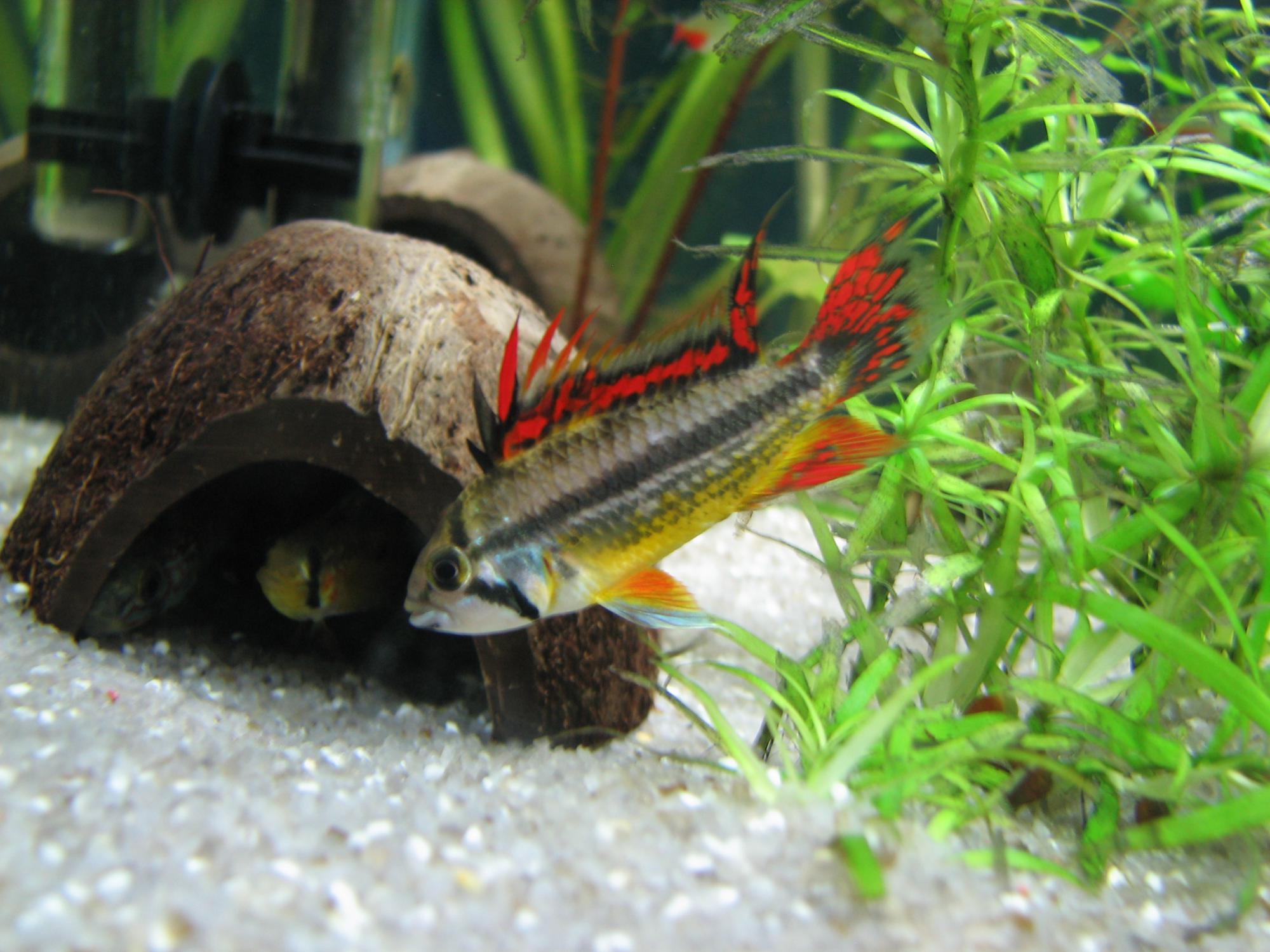A. cruzi власною персоною. Красива апістограма. Нереститься в загальному акваріумі, але коли самка починає водити мальок дуже багато "потерпілих" без врахування розміру і статі. Як правило самці теж приймають участь у виведенні малька, на стадії вилуплювання просто охороняють кладку ззовні кокоса, а коли вже мальок - то важка артилерія. Самка буває відганяє самця, але не дуже агресивно.