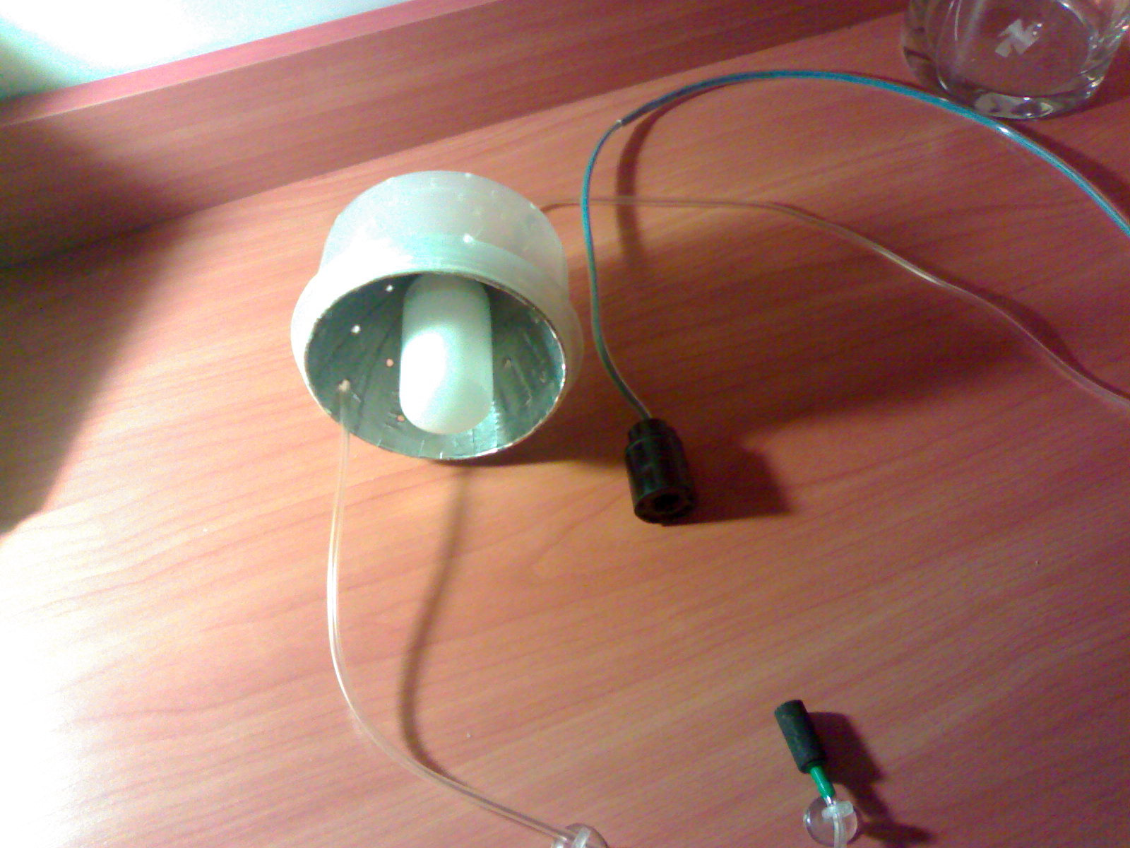 Верхняя часть крышки в виде патрона с торчащими проводами смотрелась не очень, поэтому была докуплена маленькая лейка такого же цвета, приклеена суперклеем на контейнер – патрон, провод, трубка аэрации были укреплены и закрыты.