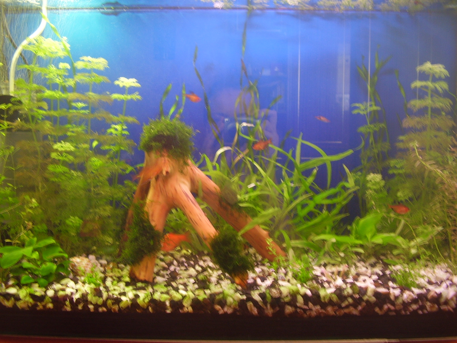 Коряга - то, что надо. Только не по центру ее ставить надо. Я бы в левый задний угол передвинул. И еще по ней - можно высверлить сверху ее сердцевину и сбоку просверлить 1 или 2 дупла, будет еще лучше. Подселить в аквариум анциструсов - будут полировать корягу.