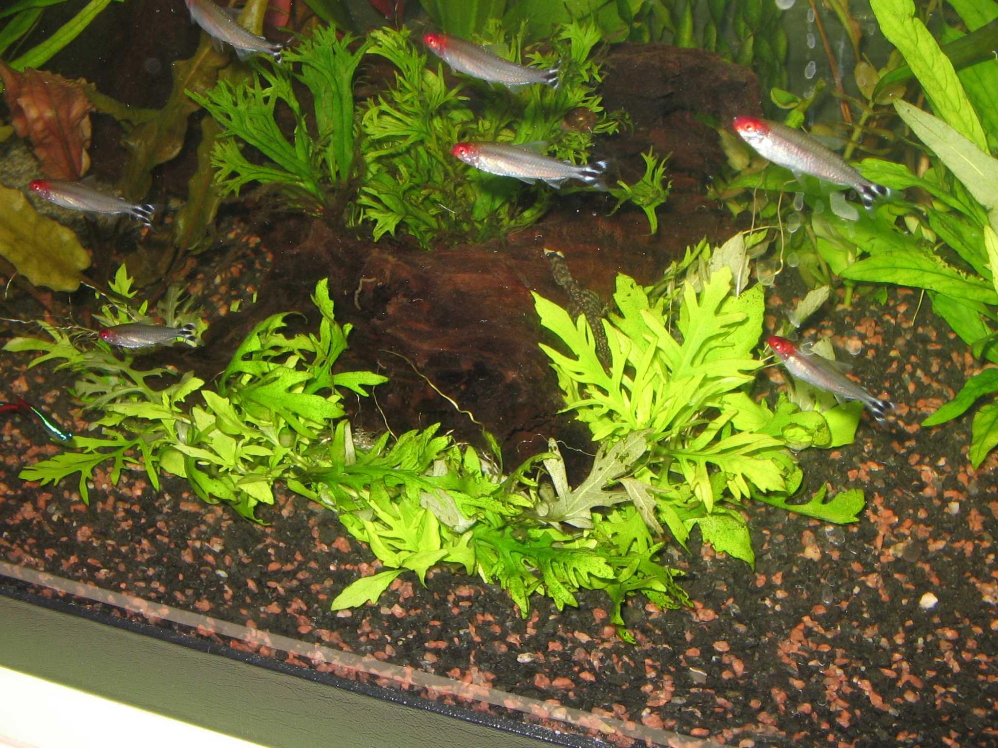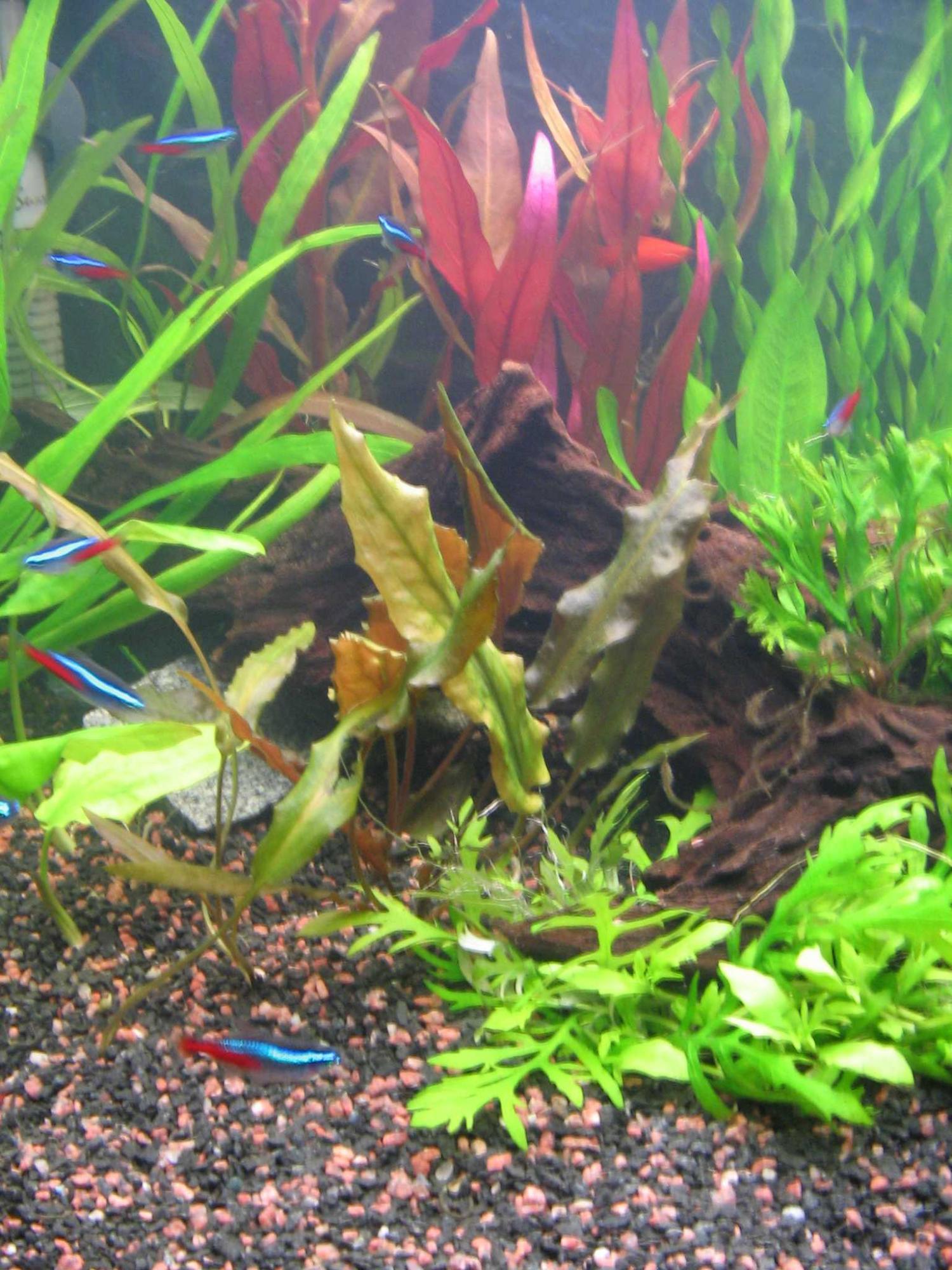А вот в большом аквариуме (14Вт/50л) на этом растении у меня от низа до середины пропали листья...а верхушка вылезла из воды...вчера вырвал, укоротил стебель и снова посадил...посмотрим что будет.