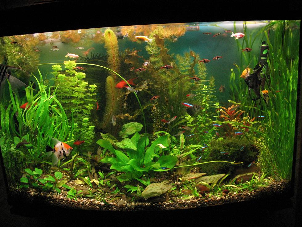 Летом прошлого года получил в подарок аквариум на 240л. Запустил в конце июля. Сейчас он выглядит так.