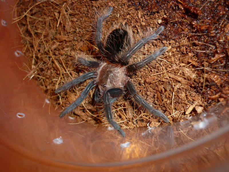 Вот почти сутки после линьки в Л4 Brachypelma Klaasi. Длина тела на данный момент 1.3 см. Линять решил в самом влажном углу, а после линьки вместо того, чтобы перебраться в более сухое место, полез на стенку. После линьки получился такой вот карапуз... На фото вид сверху.