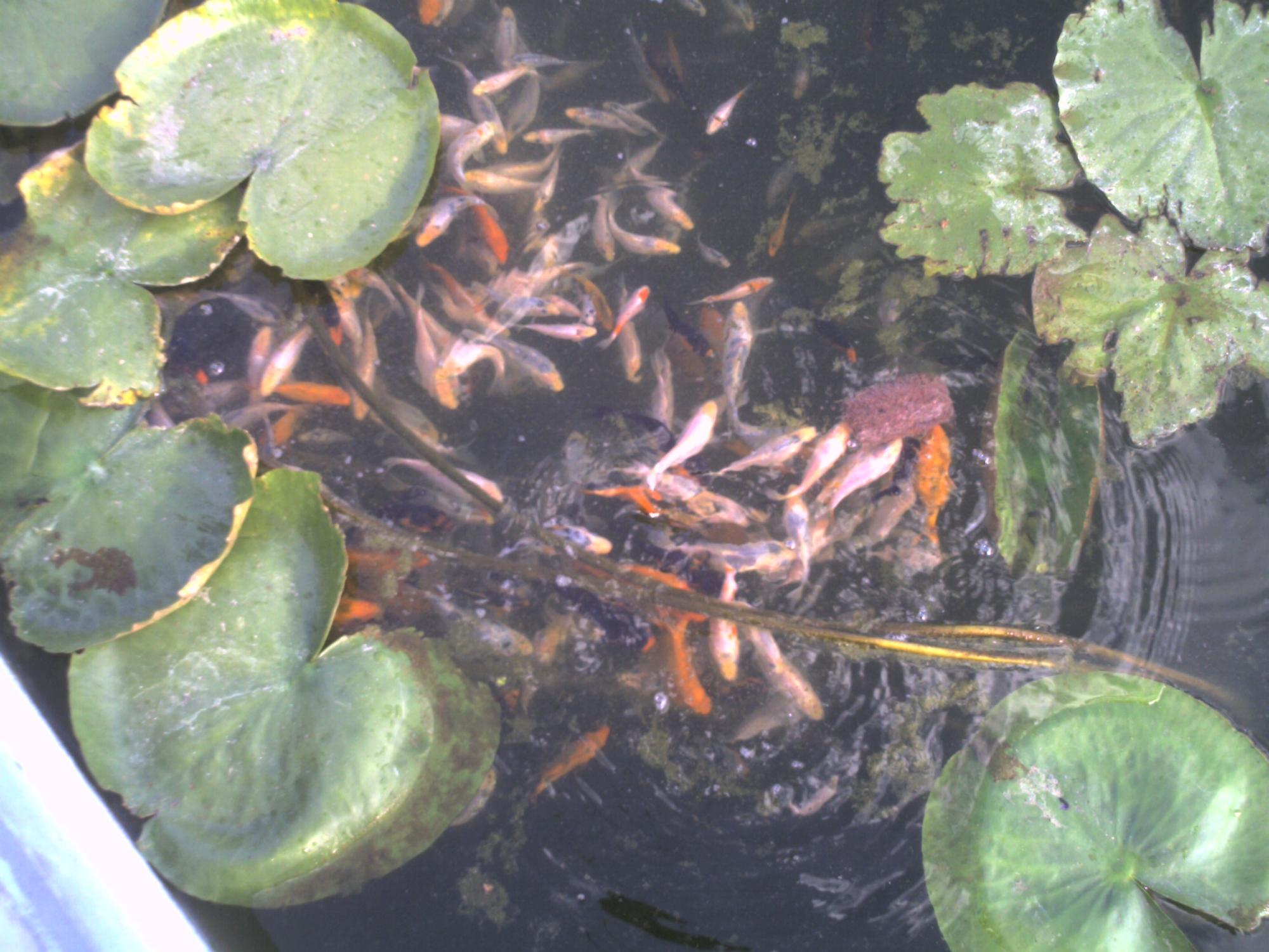 Вот еще несколько фото... "Просят" есть... А молодняк уже получил килограммовый брикет мяса артемии...  Прошу не обращать внимания на внешний вид нимфей - недавно переводился молодняк рыбы и растений в этот бассейн, соответственно сбрасывалась вода и растения травмировались и подсохли...