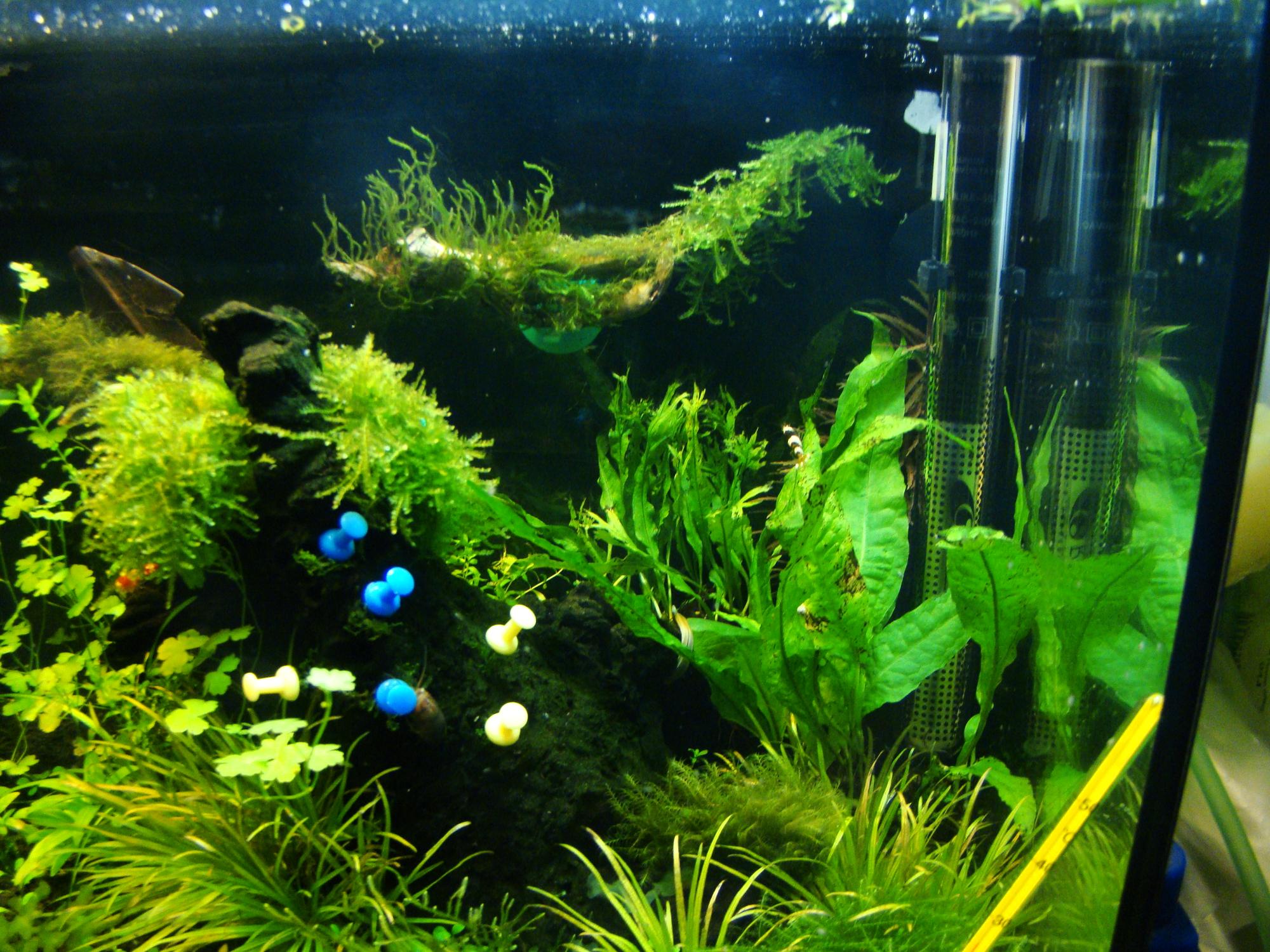 Объем аквариума 35л, через некоторое время на правой композиции из коряг начал появляться ватный грибок. Для борьбы с ним прикупила 7 ампулярий и 2 неретины зебры. Потом на больбитисе появилась белая борода, а с навесного фильтра начали свисать сопли. Заподозрив неладное я полностью опустошила аквариум и увидела что одна из ампул сдохла. Просифонила его (за неделю эта орава нагадила там немеряно) и вернула все обратно. ампулярий убрала, оставила зебр и добавила малька эндлера. Навесняк был сменен на канистру 450л/час. Вода - осмос. CO2 от бродилки, пузырь в минуту. жду когда пленка устанет нарастать. Еще хочу поменять свет.