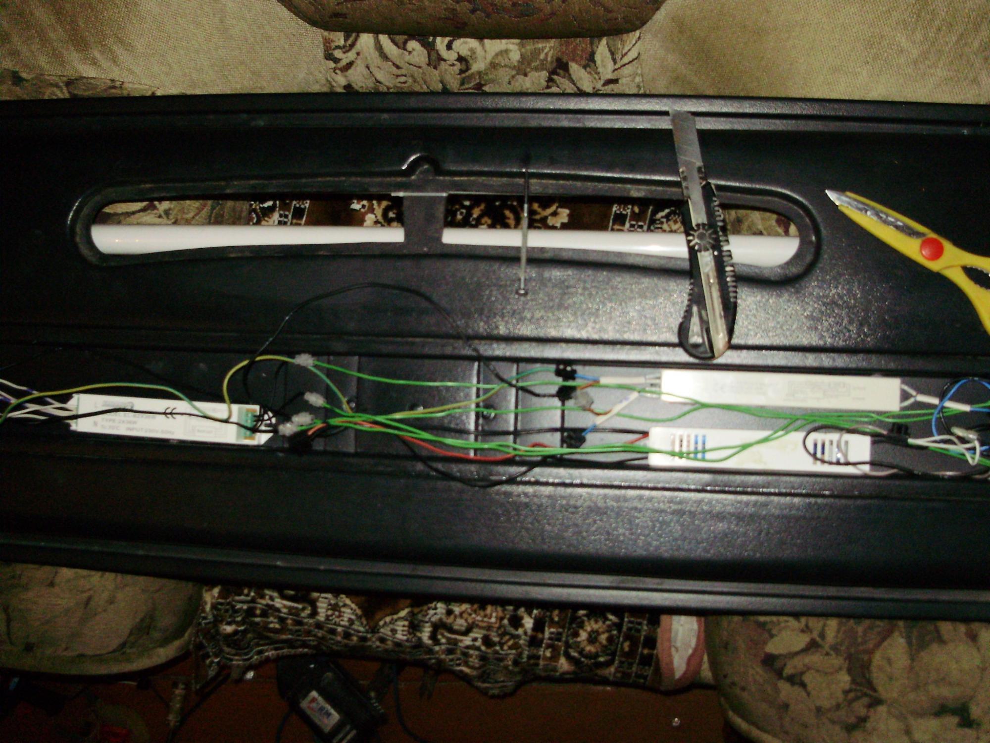 Вырезать к черту отсек для дроселя и еще пару T8 туда воткнуть можно, а пускатели в отдельную коробочку и под аквариум в тумбочку. Плюс что пускатели не греют воду ну и лампочки по отделности зажигать можно тем самым регулируя интенсивность света.
