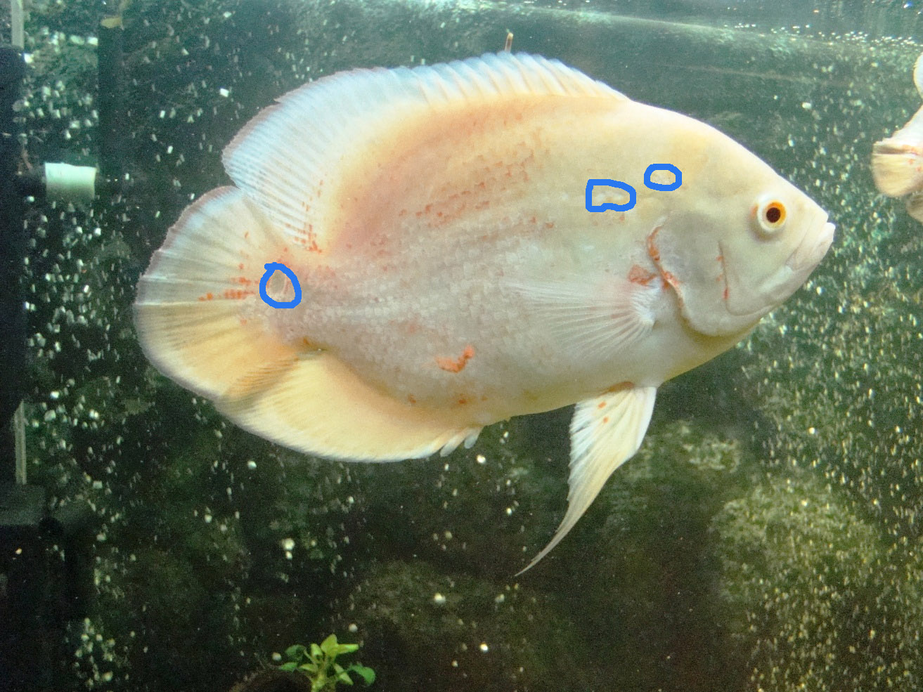 Мой самый большой и красивый астронотус стал терять цвет - прежде яркие оранжевые пятнышки сначала становятся бледно-розовыми а потом и вовсе белыми  с чем это может быть связано???? Всё это началось позавчера...