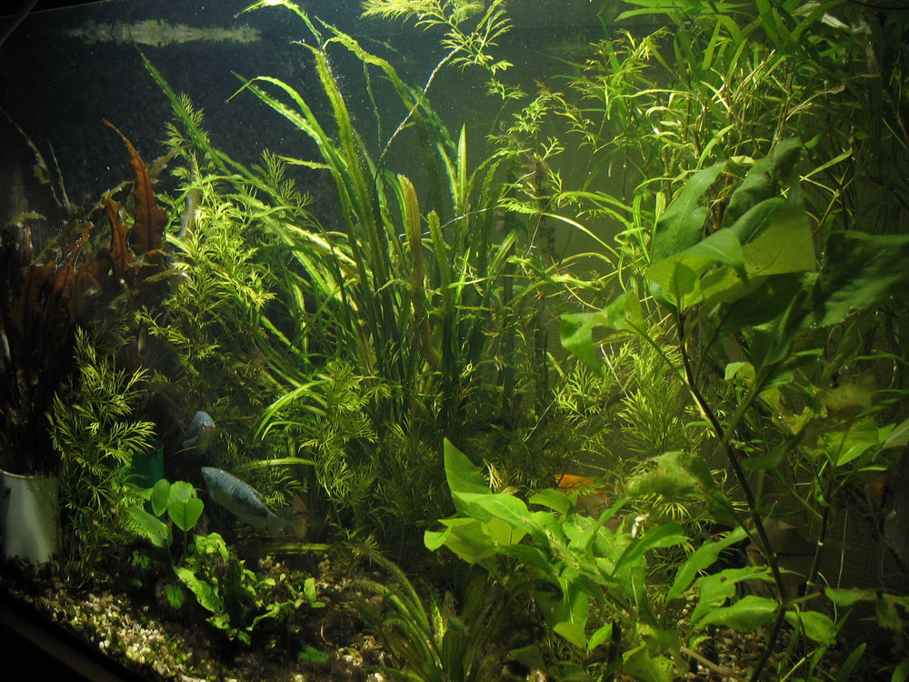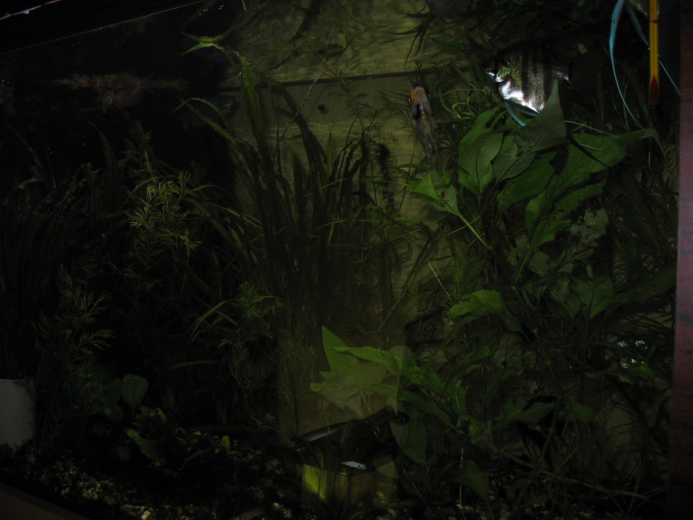 Теперь субъективно: по бокам небольшой недосвет, хотя это по сравнению с центром(придётся ставить 2ЛЛ (хорошо, покупать не придётся) в торцы аквариума, где предполагается расположить растения солитёры) им не обязательно много света.а вообше света существенно больше, и выглядит аквариум совершенно другим, заметны многие детали, тени от растений, и т д. Вода немного мутновата, только что проводил уборку, и надёргал приятельнице немного травы....