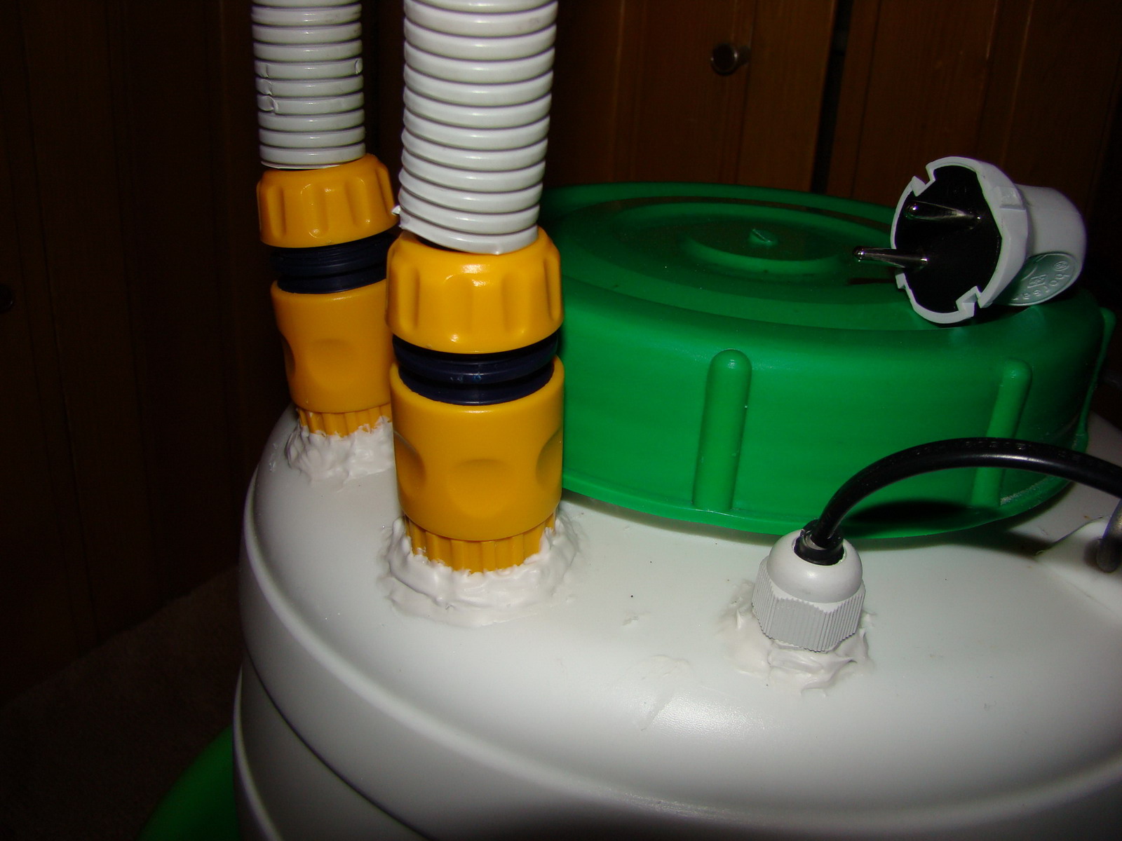 Комплектующие: 1) бачок для пищевых продуктов объемом в 20 л., выполненный из довольно толстого и прочного пластика; 2) помпа - Атман АТ-202 (1200 л/ч); 3) шланг ПВХ (14мм); 4) гофра; 5) фитинги + конекторы; 6) гермоввод; и 7) вилка для розетки.