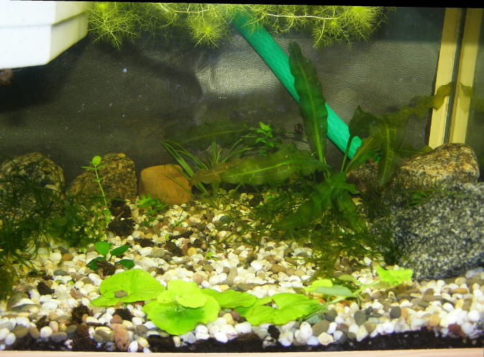 Значит, грунт укладывался так: тонкий слой какого-то мелкого гравия вулканического происхождения, слой земли сантиметра два, слой средней по величине гальки. Посадила растения, налила воды (больше половины из действующего аквариума), прополоскала губку от работающего в действующем аквариуме фильтра. В аквариуме случился... хм, армагеддец, другого слова не подобрать.  )) Крошки земли всплыли на поверхность, поднялась жуткая муть. Поглядела я на это несколько часов -- и включила фильтр. Подумала и досыпала гальки поверх всего -- под руку попалась мелкая. Через несколько часов фильтр забился напрочь, помыла, поставила снова. Через несколько часов снова пришлось мыть. На данный момент имеем прозрачную воду желтовато-коричневатого оттенка с запахом земли, илистый налёт на растениях. Тетровский тест 5-в-1 говорит об изрядном количестве нитратов в воде и присутствии нитритов. В остальном вода как вода, без особых скачков в какую-то сторону от аквариумной и водопроводной, которые были залиты.