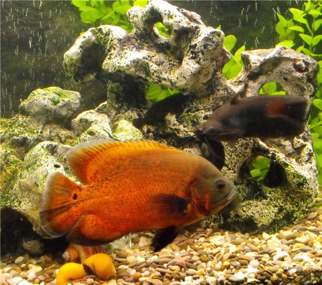 Поэтому тем , кто собирается содержать астронотуса с другими цихлидами(особенно не крупными) я посоветовал бы достаточное внимание уделить питанию рыб и соответствущему объёму для их содержания ,а так же позаботиться о достаточном колличестве укромных мест для некрупных рыб ,где в случае необходимости они всегда могут спрятаться. В хорошем объёме астронотус в сообществе с другими рыбами это зрелище красивое и интерресное ,а гармонично подобраный аквариумный "коллектив" доставит много часов радости своему хозяину.