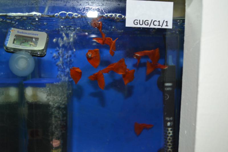 Ни одну рыбу толком не видно, точнее главного украшения гуппи - хвостового плавника. Понятно только что альбиносы..