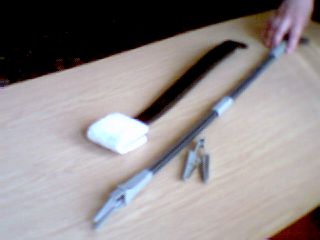 Это щетка на длинной ручке и складной манипулятор со сменными насадками (щипцы и ножницы)