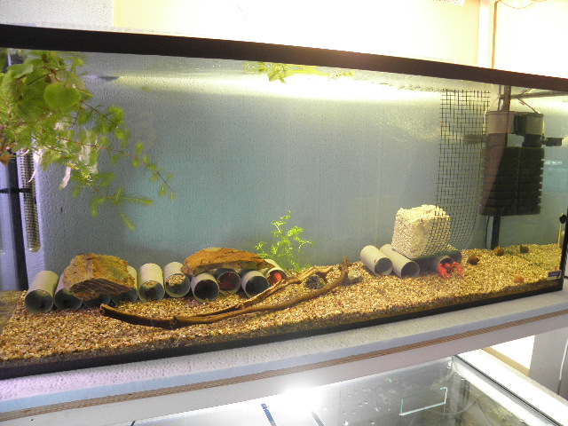 Добрый вечер всем.Хочу рассказать о своих красавцах Procambarus milleri (Рак мандарин).Информации о них мало ,так как он мало изучен. Вот какую удалось собрать информацию с различных источников. Обитает в природе в водных пещерах под поверхностью земли ,родом из Флориды ,обнаружен в 1956 году в Майами ученым Миллером .Цвет варьируется от ярко-оранжевого до желто-оранжевого.Максимальная длина около 8 см .Продолжительность жизни около 7 лет.Температура воды 18-30 .Жесткость воды 15-20. PH 7-8.Рак- мандарин находится в природе на грани исчезновения .На многих сайтах написано мирный в содержании,мне по началу как то не верилось,имея опыт содержения и разведения флоридцев и кубинцев.Но наблюдения мои в течении года показали ,что действительно можно содержать с мелкими неагрессивными рыбками , при наличии нормального кормления .У меня они живут с меланотениями трехполосыми радужницами, барбусами суматранскими ,барбусами мутантами,креветками черри.При кормлении всеядны. Красиво смотрятся в аквариуме с черным грунтом и приглушенном освещением .Содержание с растениями раков возможно.Из наблюдений за мандаринами могу сказать какие растения они не трогают.Это жестколистные растения ,а так же валистнерию, нимфей.Это связано скорее с тем ,что в местах где они обитают (подземные пещеры флориды) нет ни растений ни рыбы .