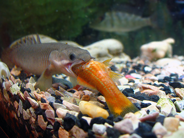 ...взрослые мелкого не трогают?... Хотя, у меня мелкого сенегальца (ок. 15 см. ) старший брат гоняет, а дельгейзи, который кратно крупнее и мелкого и большого вообще на них ноль эмоций (правда, они стараются от него подальше свалить, когда он вылезает на поляну, где креветки разложены). Выглядит так, как будто у них только внутривидовая агрессия, а к другим полиптерусам ровно.