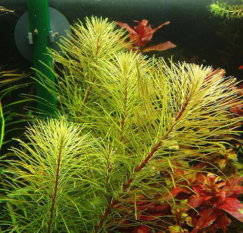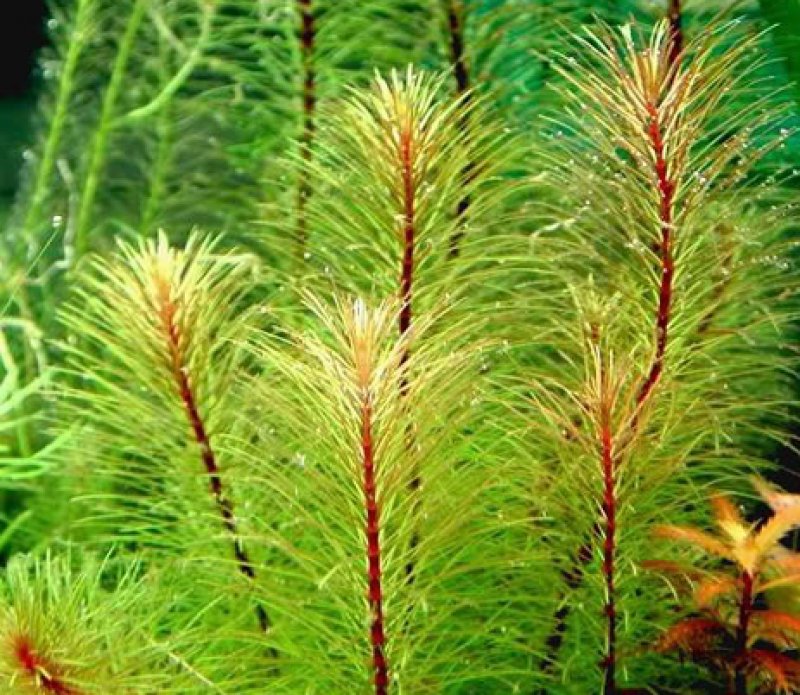 Перистолистник красностебельный (Myriophyllum heterophyllum). Симпатичный гость с Флориды, с красным, растущим очень длинным стеблем и зелёными листьями. Становится особенно красивым, если позволить подросшей веточке лечь на поверхность и в ток воды.