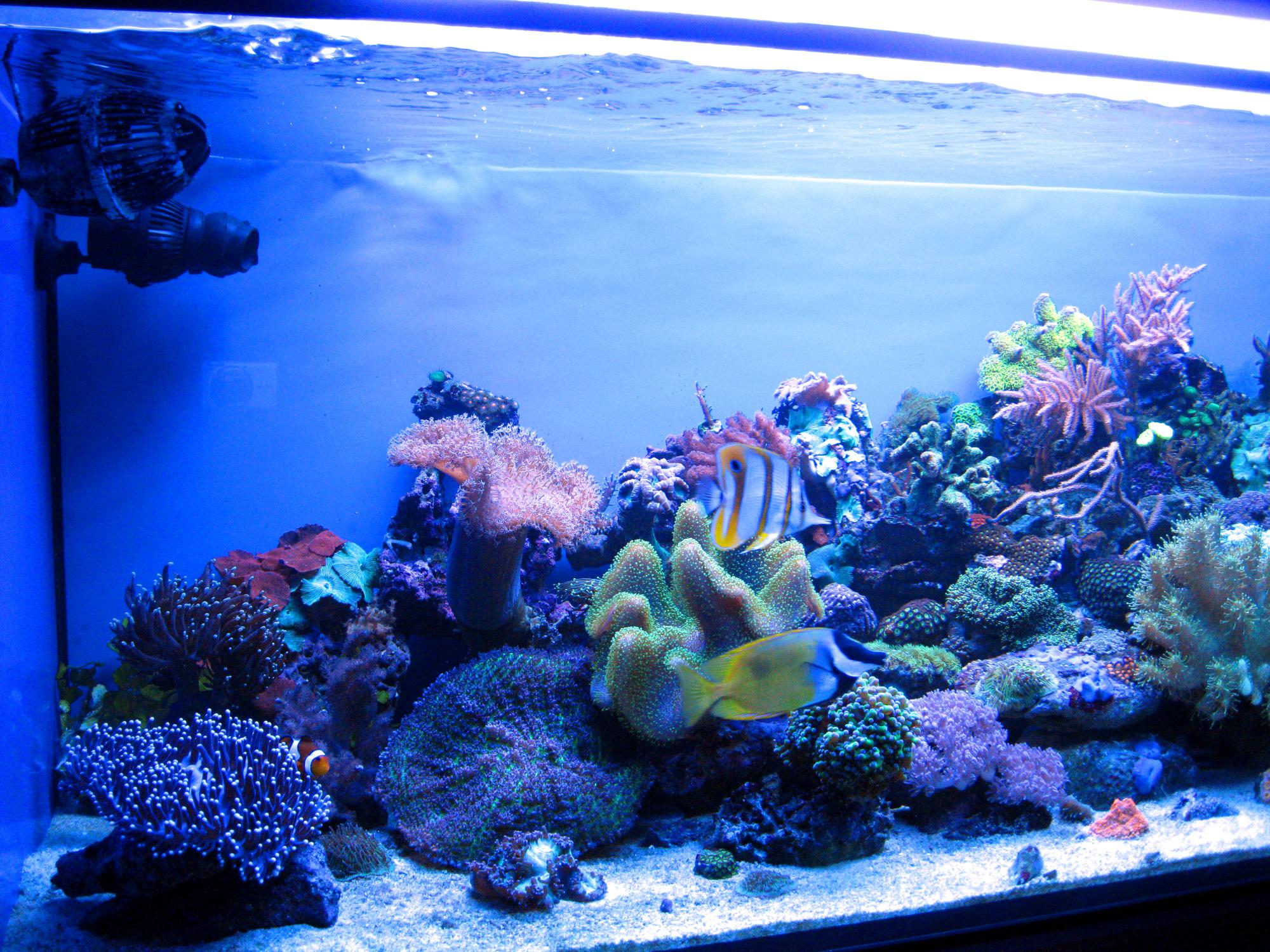 Добавлю с вашего позволения немного новых фотографий .В конце того года установил новую морскую банку на 700л + самп ,ну а также осталась старая на 400л. Фото через пару недель после переезда .