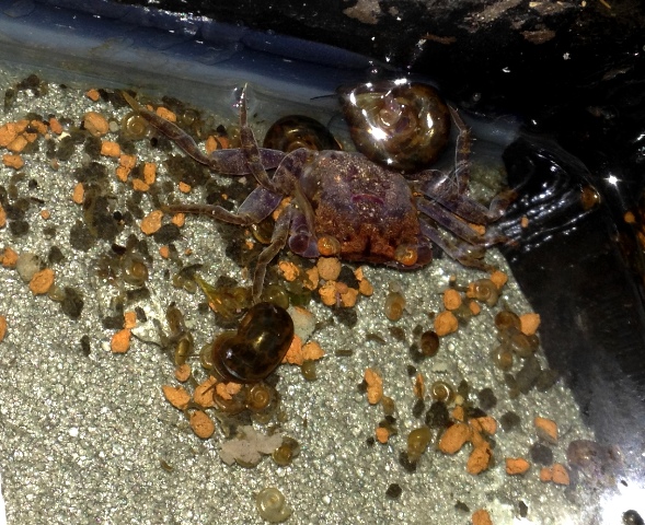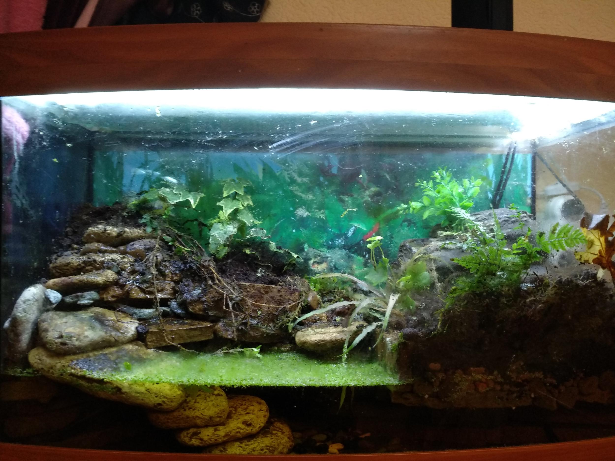 Крабы живут с октября.Пока ничего не меняла внутри.Работает фильтр аквариумный,который делает маленькие водопады.
