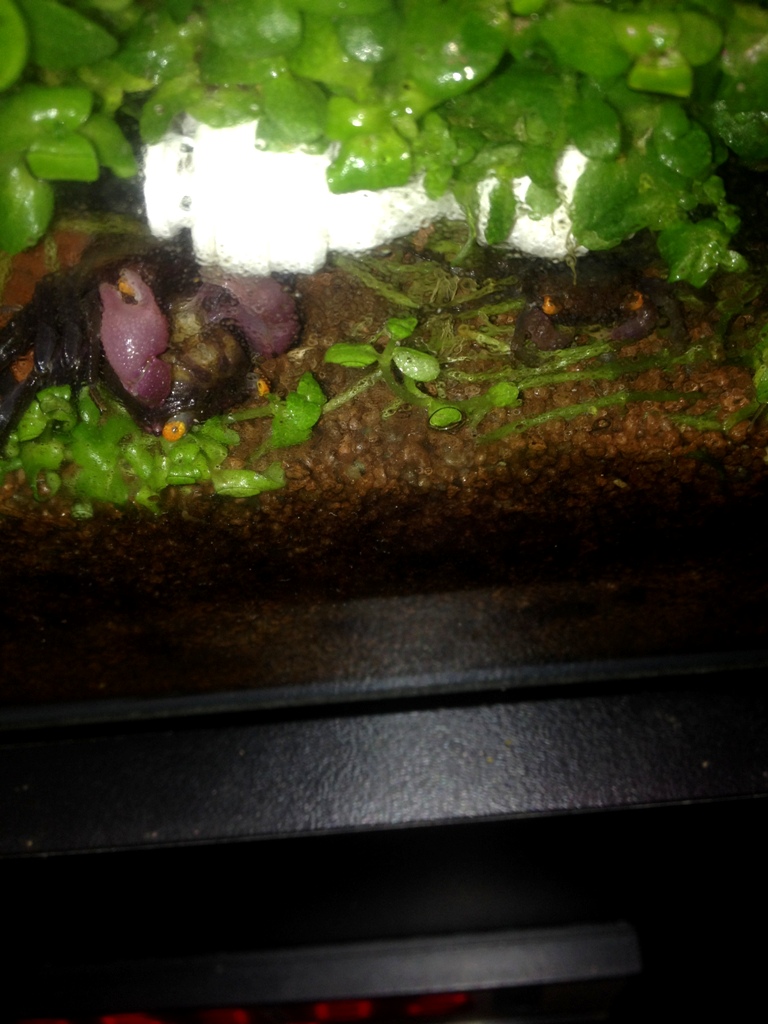 Когда разрослись мох и нитчатка на мелководье (4см) , плавающие поверхностные растения смогли опиреться на эту подушку и выдарживать вес крупных подростков крабов . Крабы же с удовольствием используют перемещения по такой поверхности.