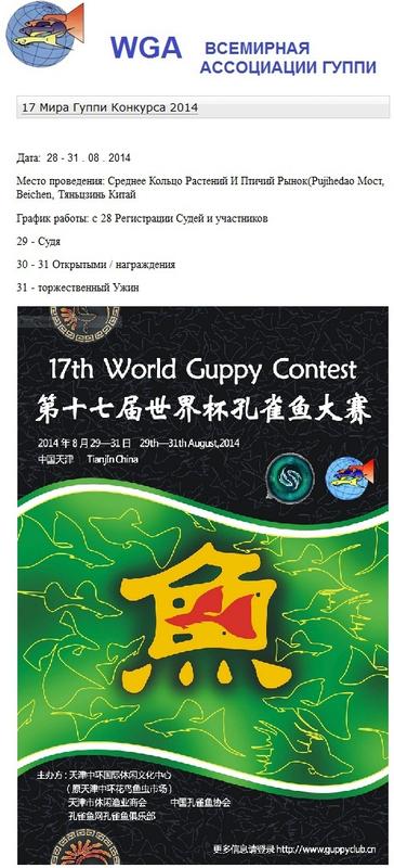 Всемирная 17 -я в-ка гуппи пройдет в Китае в конце августа , см. фото 6 . На фото 7 расписание выставок проводимых в системе WGA - Всемирной Гуппи Ассоциации.