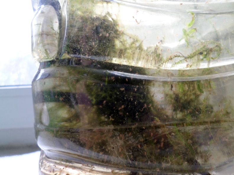 Мох получился обычный, похож на яванский, только немного светлее, растет интенсивно, так его еще и не вытащил из обрезанной пятилитровки. Интересно другое, в этой таре дафний немеряно, подкармливаю сухими дрожжами раз в три-четыре дня, прямо кидаю несколько гранулок, не расворяя. Немножечко дафний отбираю. Были запущены несколько ракушечковых рачка, эти перестали размножаться, есть очень крупных несколько, и все. А дафнии еще и яйца стали сбрасывать, буду собирать эти эпиффии.