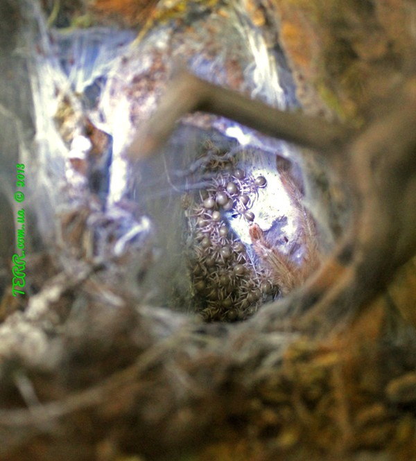 С этого момента стал понемногу давать самке корм. Охотилась она, не покидая пределов гнезда, все повреждения стенок и собственные ходы ремонтировала и заклеивала практически мгновенно. Чтоб кормила малышей, как это делают те же Monocentropus balfouri – не видел. Склонен предполагать, что псалмопеусы не заморачиваются кормлением потомства. Все ограничивается только присмотром самки за малышами и их охраной. До определенного момента.