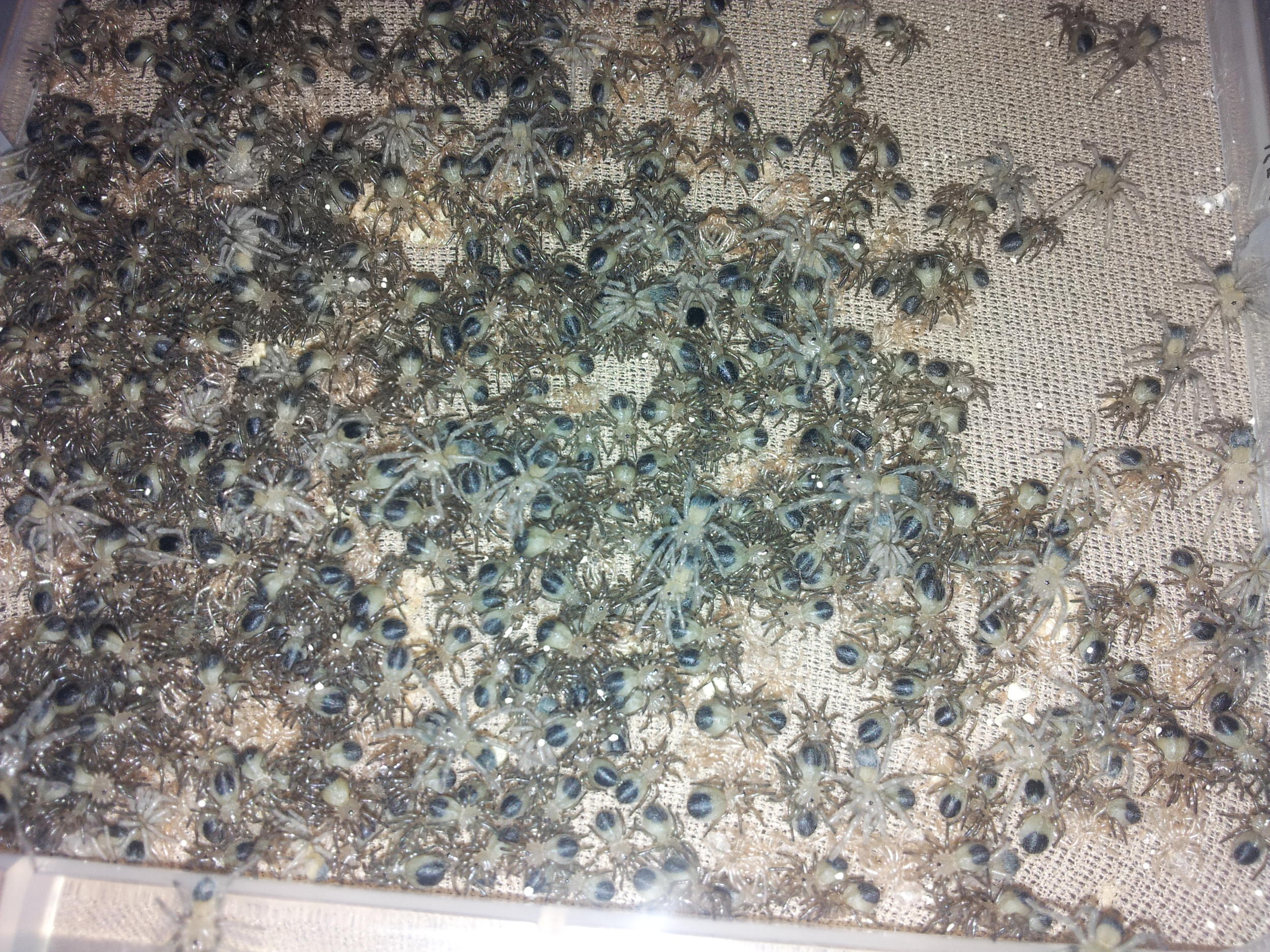 После того, как самка вскрыла кокон малышня расползлась по всему терру и только по какому-то незаметному мне сигналу мамаши собирались в кучу.