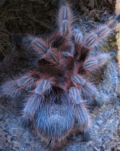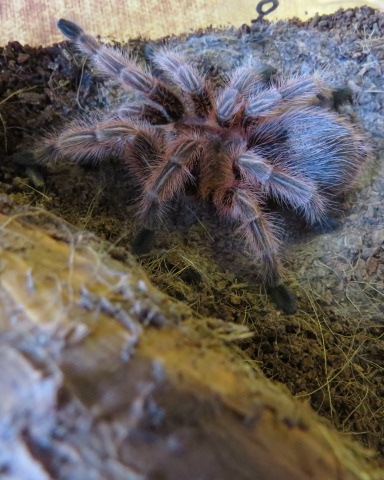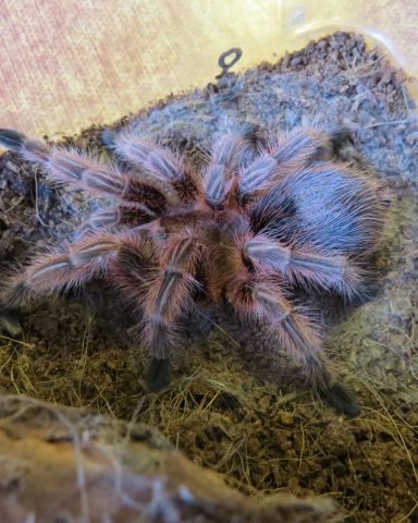 Очень недовольная мадам Г. Пульхра. Часа 3 пробыла в такой позе после моего вмешательства в терр. А вообще - очень интересный паучок - в какой бы части терра не находилась, как только я открываю дверцу - сразу приходит глазеть, ну или защищать территорию. Фото №2 - наконец-то начала использовать декор по назначению)