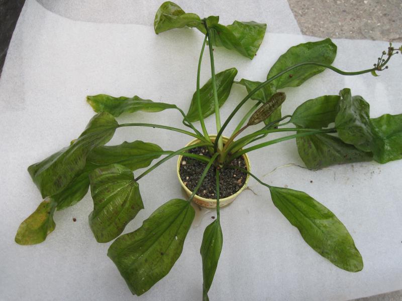 Продам эх "Большой леопард" (маточник). Одну детку уже снял, ещё две развиваются. Вообще этот эхинодорус по-моему совершенно безпроблемный и детки даёт хорошо, стабильно. У меня просто ещё один более крупный маточник "леопарда", с которого я регулярно стригу детки, а недавно даже перевёл одну из них в сухую форму (и она тоже уже дала стрелу!). А этот эхинодорус, который продаю, думал другой вид, ждал пока станет взрослым. Стал. Такой же. Значит продаю, пусть ещё кто-нибудь детки стрижёт!  Значит хочу за маточник 70 грн. Вроде ж недорого? Фотки прилагаются. Кстати эх растёт в тесных условиях и с недостатком освещения (вечная нехватка свободного места в аквариумах!  ) Поэтому к сожалению не может предстать во всей красе. Фотки деток эхинодоруса "Большой леопард" (и других моих эхов) можно посмотреть в моей теме: