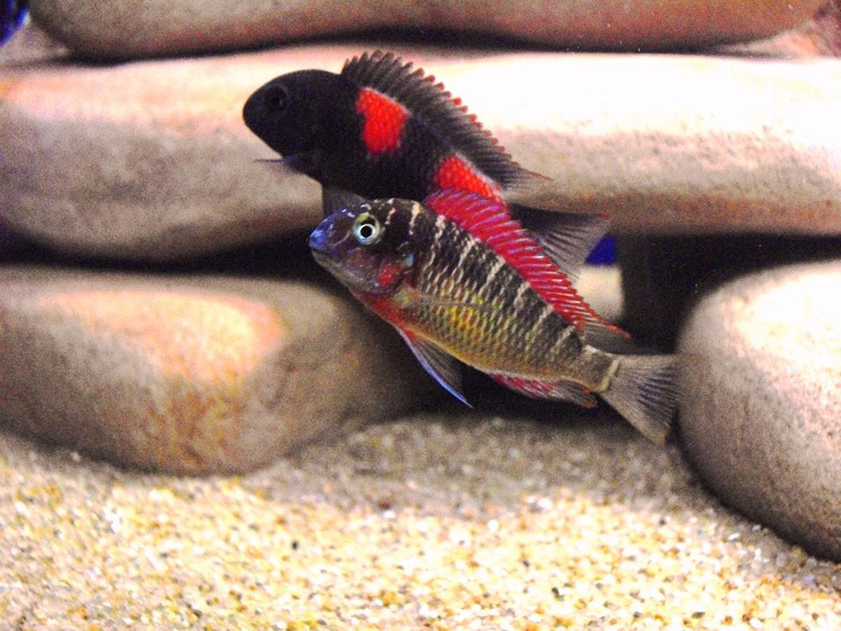 Neolamprologus buescheri "Kamakonde": між ними різниця у віці десь місяць, а по кольорах старший вже красень, хоч на обкладинку журналу подавай.