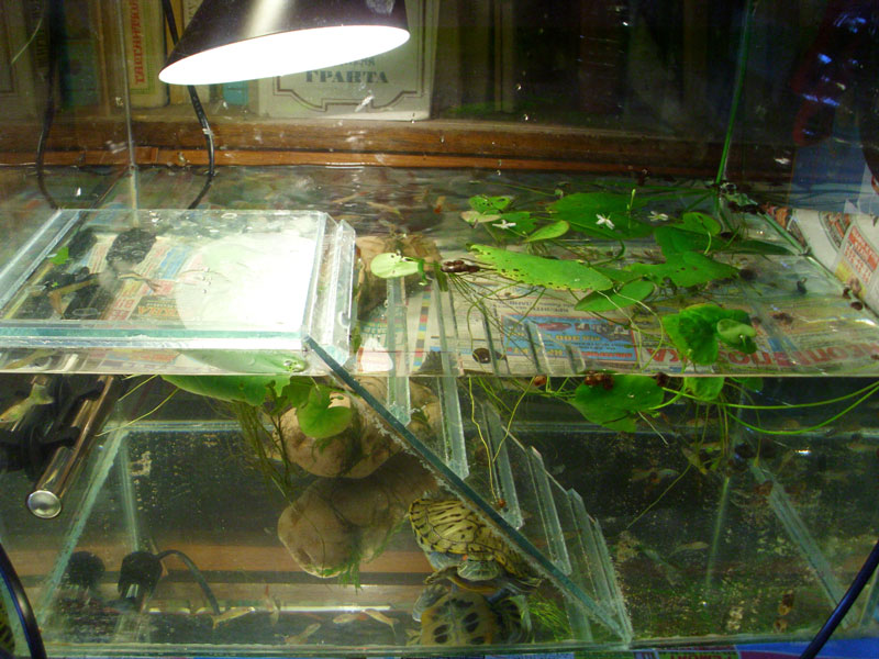 помимо черепахи живут катушки и гуппи на корм, нимфоидес и циперус)