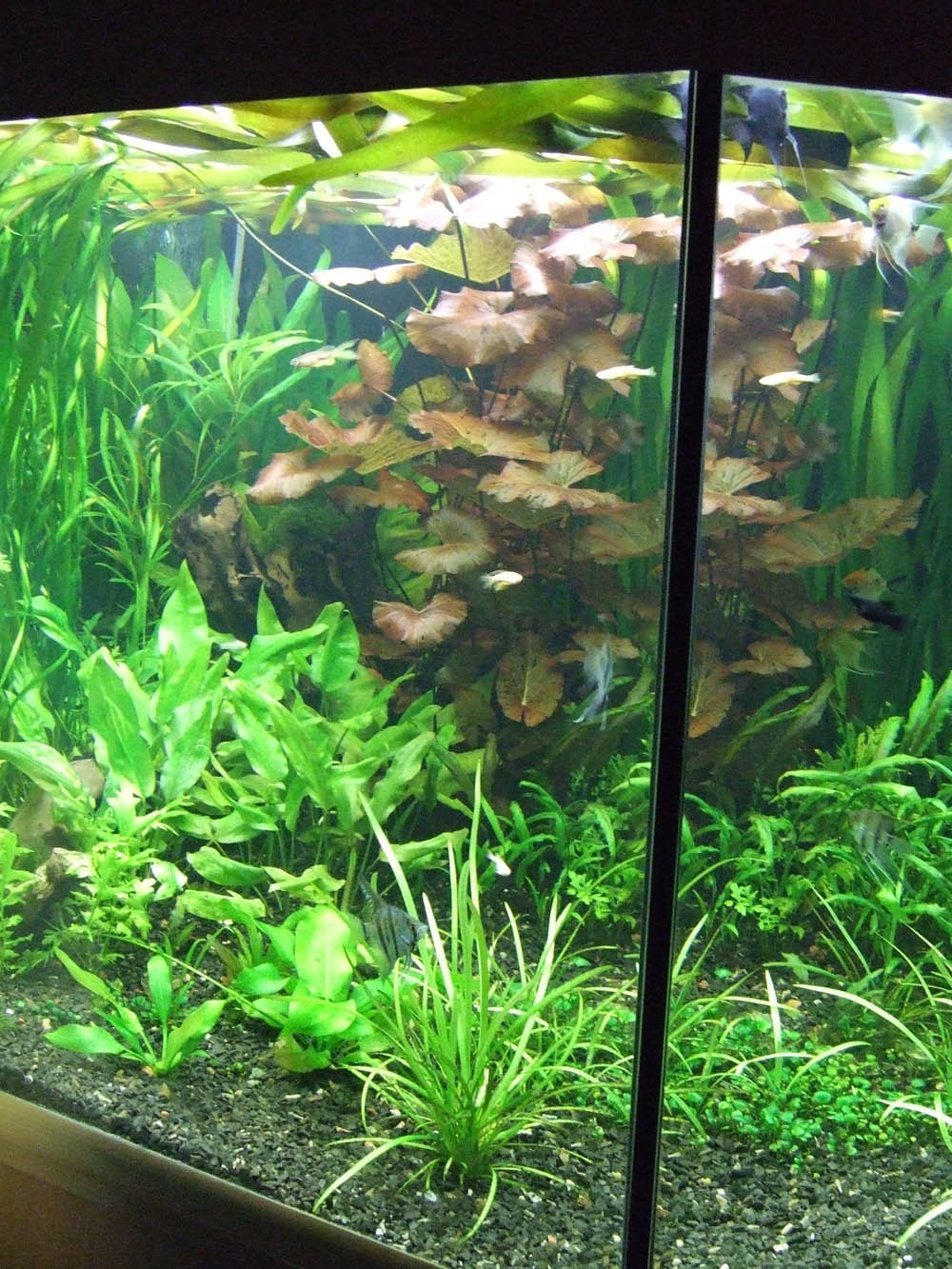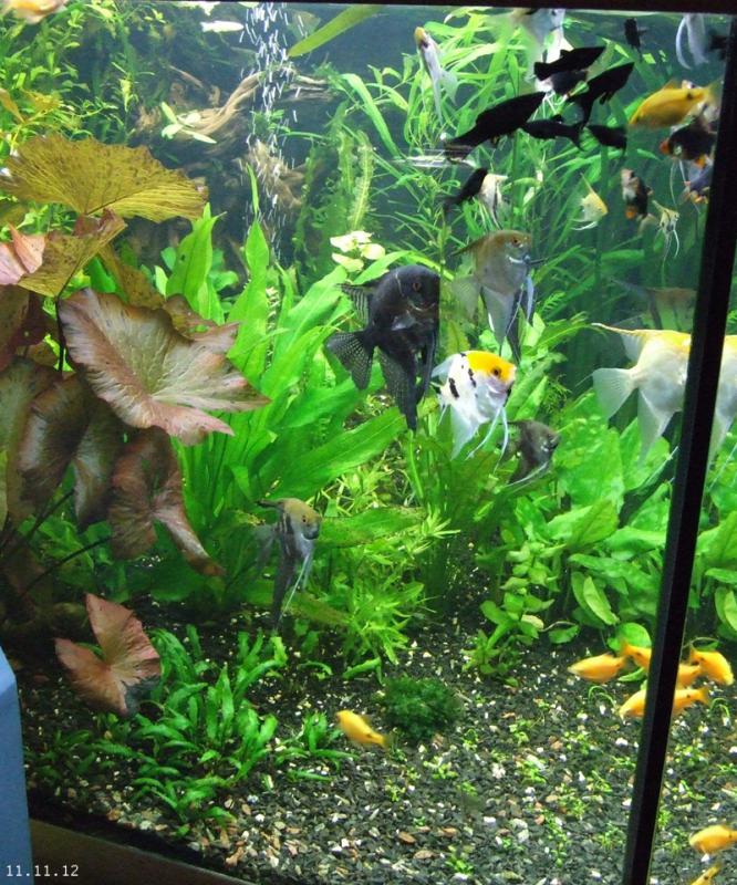 Так как перезагрузка у меня заняла почти две недели (еще и горячую воду отключили), то много растений погибло  а некоторые которые вы видите приходят в себя сейчас. Нимфея побрасывала листья, но выпустила много новых, некоторые эхи покрутили листья, но выпускают сейчас новые прямые листочки. Вобщем наращиваем сново массу растений. Рыбы так много (особенно скалярий) так как это рыба уже моего разведения, собираюсь тут на форуме раздавать/продавать.