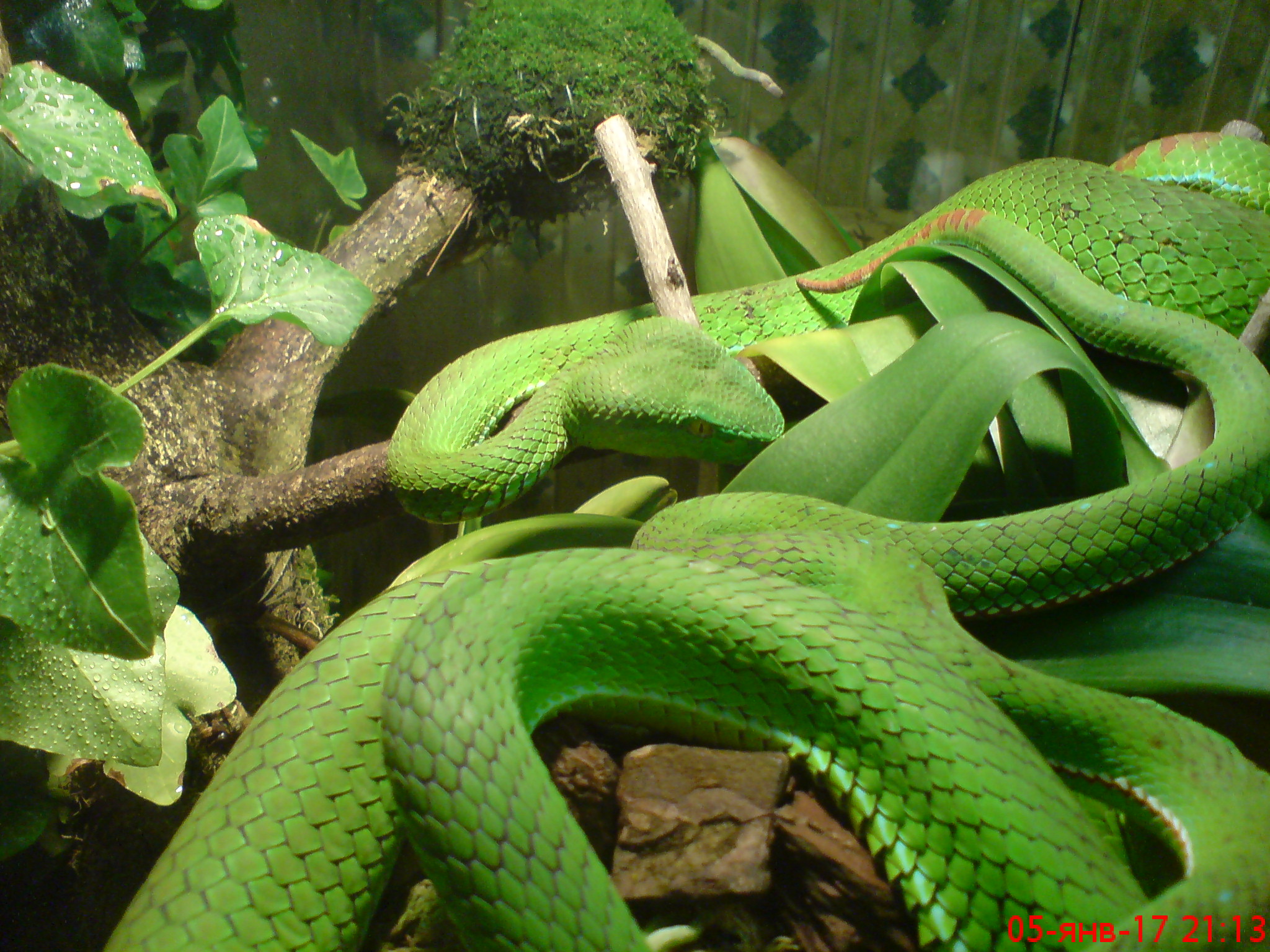 влажность поддерживается за счет опрыскивания дистиллированной водой дважды в день в 12 и 21 час. в 12 часов опрыскиваю и змей вечером только террариум. влажность находится на уровне 75-90%.