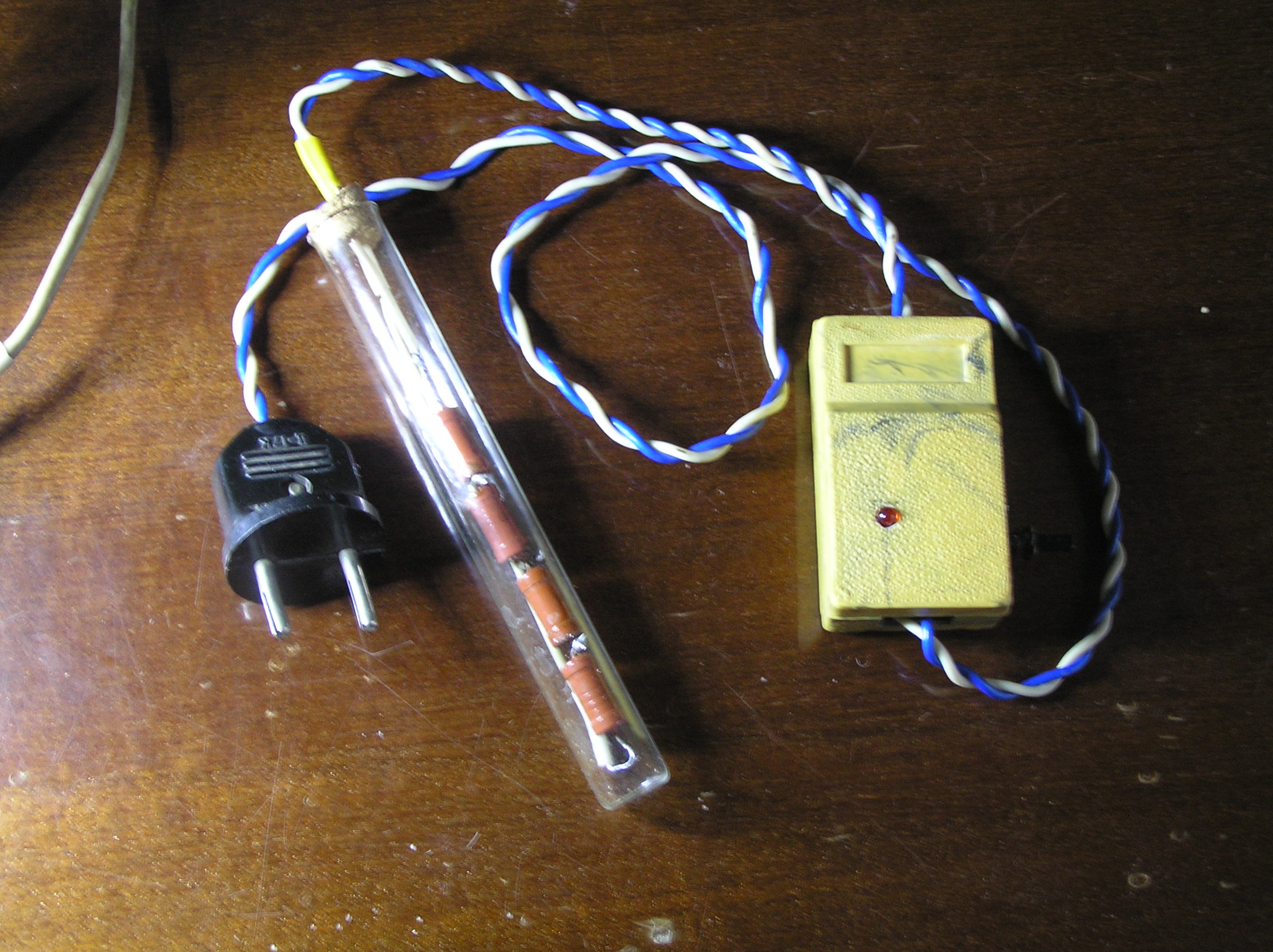 3. Но, один из 4-х нагревателей решил сделать регулируемым.Нашел на сусеках коробочку от декодеров телеканала Симона(Помните,конец 80-х,начало 90-х годов?:>)) В коробочке поставил переключатель.Собственно,это его же переключатель изначально.И на переключатель,в разрыв одного провода питания,запаял диод.Теперь можно пользовать либо всю мощность грелки на 15вт,либо половину за счет работы диода.