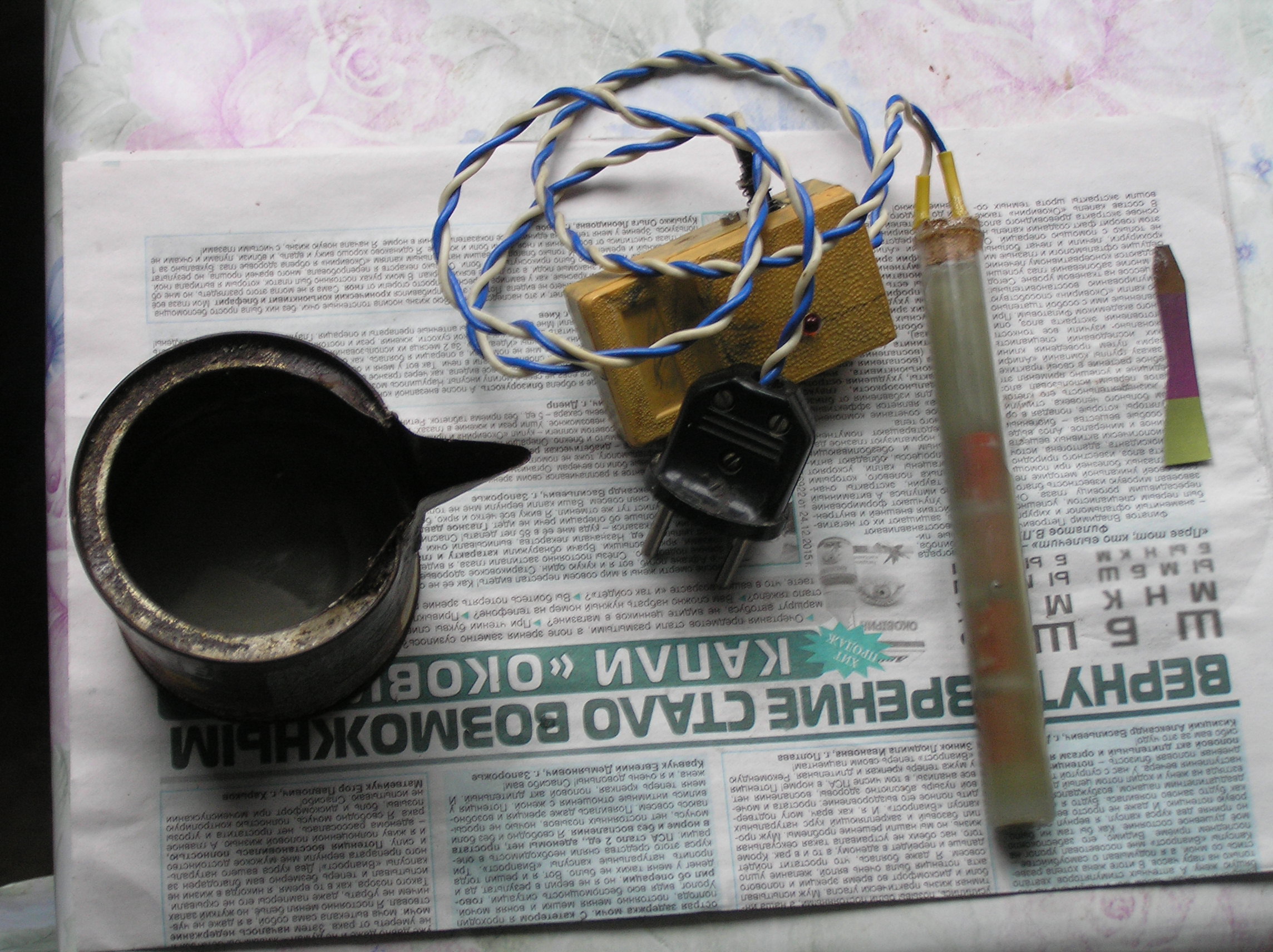 на фото видны последовательность и некоторые детали.Да,забыл сказать.Раз уж коробка была с диодом,то втюхал туда и индикатор тока нагрева на светодиоде.Но это от излишества,хотя и удобно.Светодиод светит только при прохождении тока.И еще.Пришлось для качественной заливки парафина сделать такой ковшик с носиком из маленькой баночки от кофе.20мин и готово.Но можно обойтись и подручными средствами..