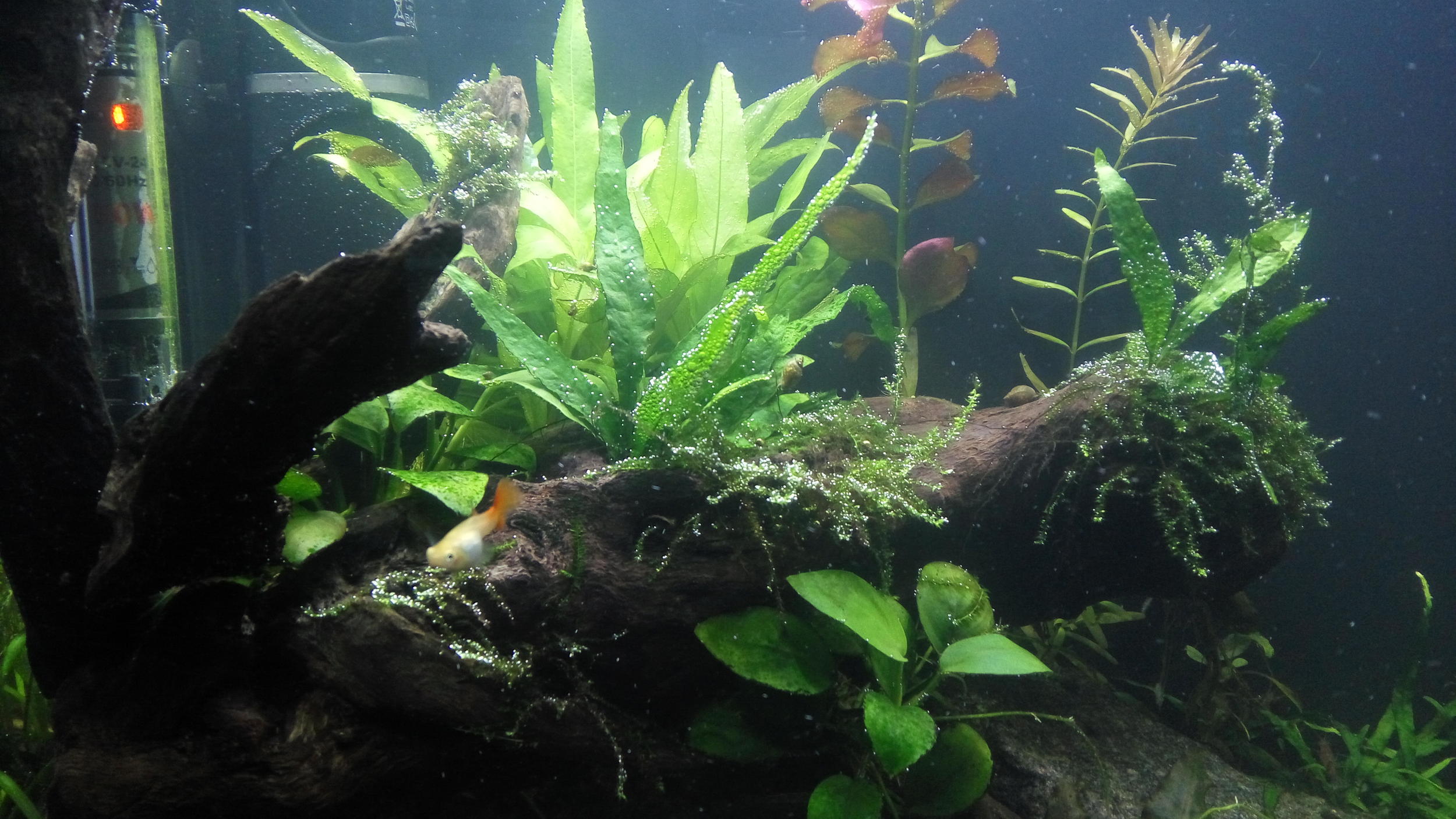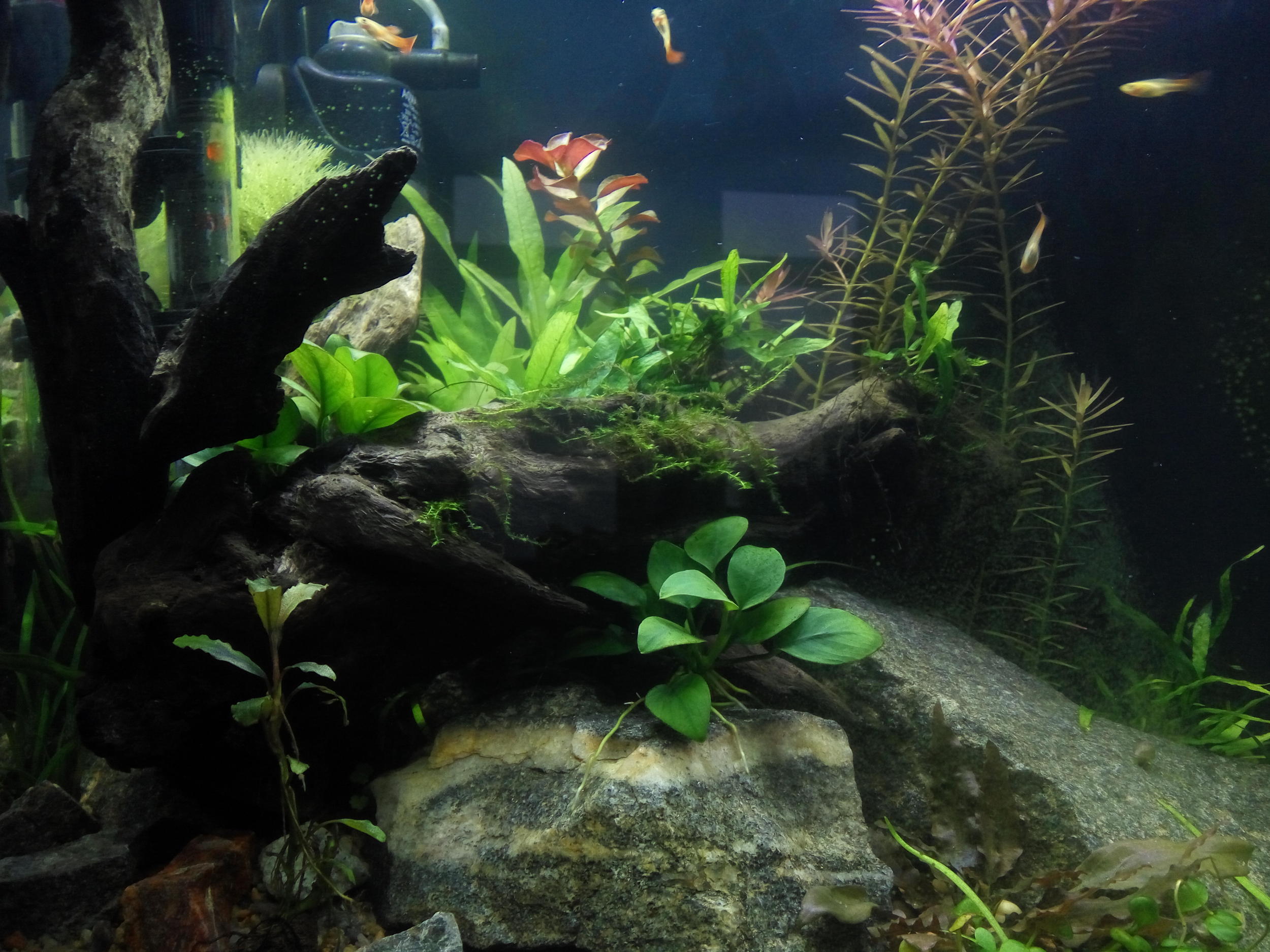 С подготовкой конкурса, аквариум был практически заброшен... Только подмены и то не регулярные... Повырастало, сткла позеленели, песок заилился... Вчера чуток прибрался и закинул мох на лаве, убрав на задний план буцку....