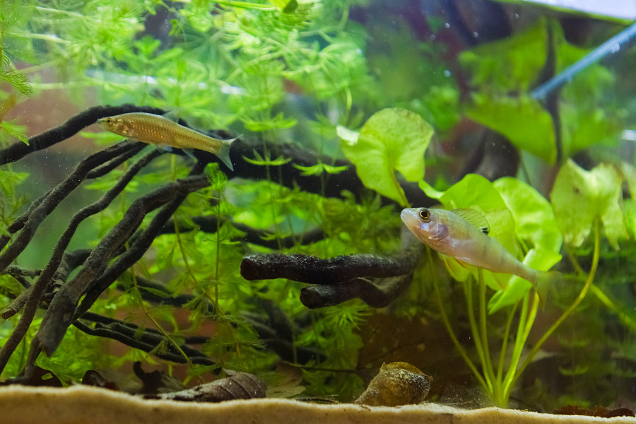 Риби, підрісши, почали активно втручатися в аквадизайнування, зачіпаючи при плаванні (ротань-головешка) чи вириваючи з грунту (карасі, чебачок). І якщо кушир при цьому піднімався до поверхні і там спокійно продовжував рости, то дрібні стебла елодеї затягував і дрібнив фільтр, видаючи рибам їстівний силос. При заміні нижньої частини фільтра на губку він переставав затягувати продукти життєдіяльності риб, аква при цьому за 2-3 дні ставала настільки брудною, що на неї було страшно дивитися.